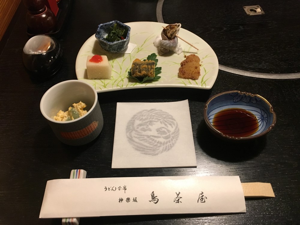 少し投稿が遅くなってしまったけど、今回は神楽坂の鳥茶屋です。電話で予約すると、コースを決めてくれとのこと。皆で話し合って月、雪、扇と3種類ある会席コースの中の真ん中の雪コースにしました。これは一番安い月コースに加えて酢のものが追加されていて、さらにお造りが上にアップグレードされているものです。一番高額な扇は、これにさらに中皿が加わり、お造りも特レベルになるようですが、確か以前の経験上うどんすきの量がかなりあって食べるのがきつそうなので真ん中にしました。