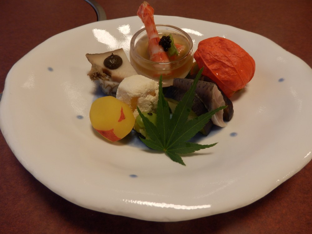 前菜ですが、それぞれなんだったか覚えきれません。ただ結構良かったですね。まず最初に食べた紅葉の裏に隠れているそら豆が意外な味でかなりおいしい。出汁などでしっかりと味をつけてあるようですが味付けが良い。左の黄色のものは芋に見えるのですが、食べてみると味は栗のよう。白く中に黄色の色が見るのは、マンゴーの白和えでこれはかなりおいしかったです。その後ろのもずくとアワビだったかも、アワビはかなりやわらかくほかのも全般的にレベルが高い。