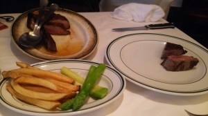 でこちらは、一緒に行った人のサーロインステーキにポテトとアスパラガスの付け合せ。サーロインなのに骨付きで出てくるとはびっくり。こちらもきれいな焼き加減でさすが。