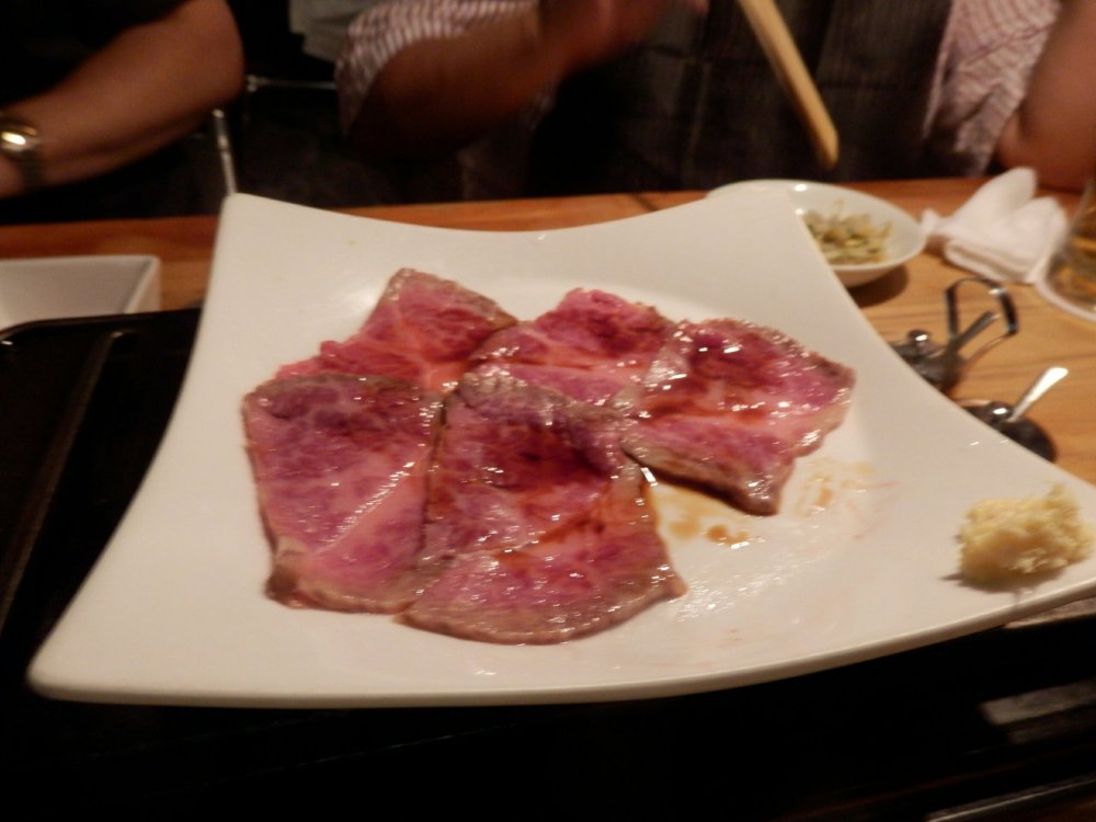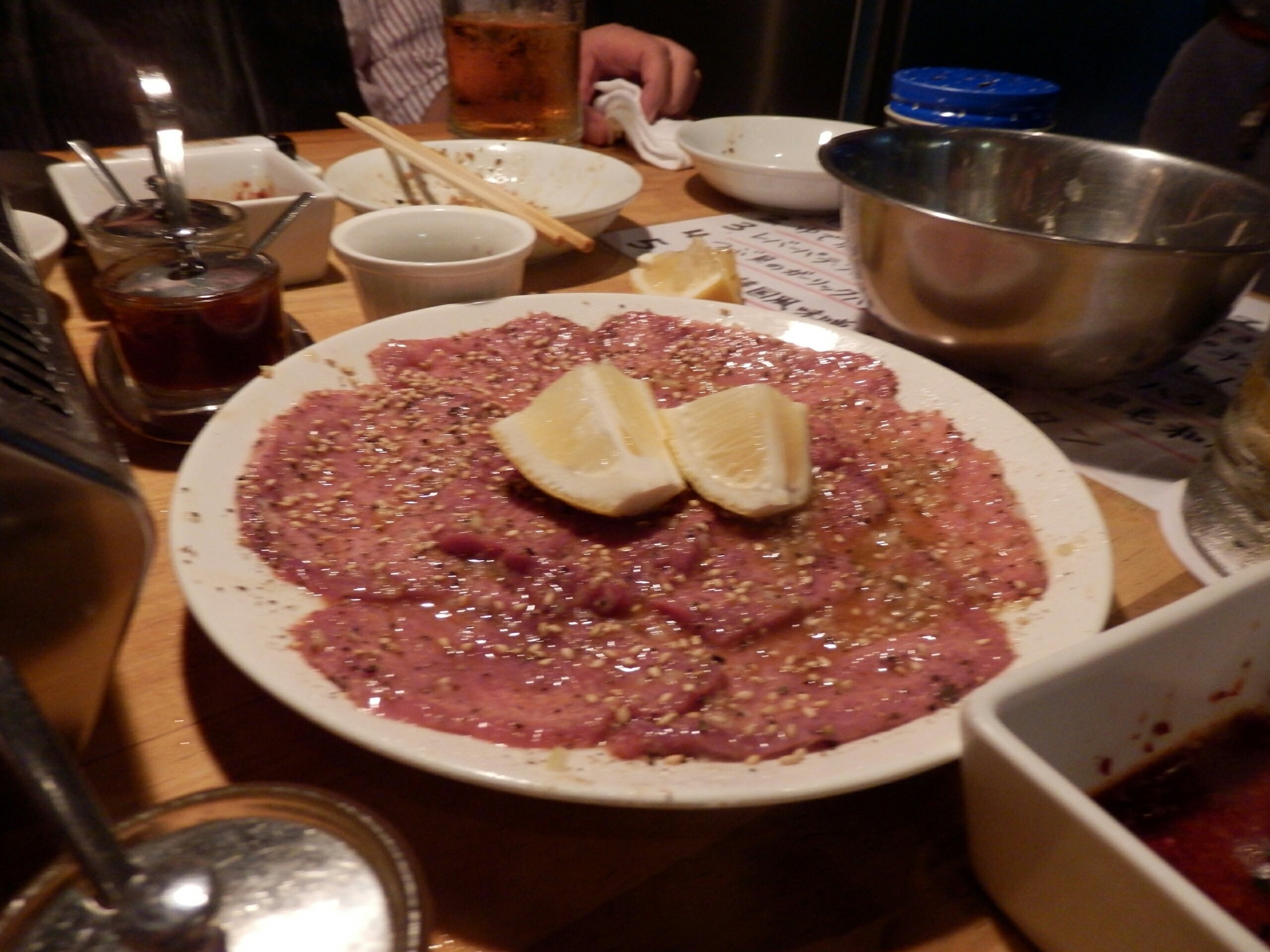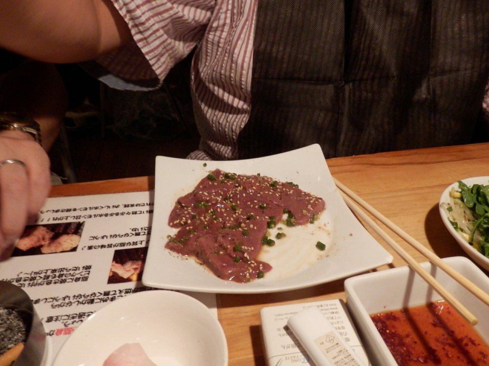 店員さんからオススメを教えてもらった中で注文した生の肉のなんか?正式なメニューの名称は覚えてません。写真では5切れしかありませんが、これは私が思わず一切れ食べてしまったためで最初は6切れでした。あまりのおいしさに感動。4人で6切れだったので、あとでまた頼もうと決意。でも結局いろいろ頼んでお腹いっぱいで結局一切れしか食べられなかったのが残念です。