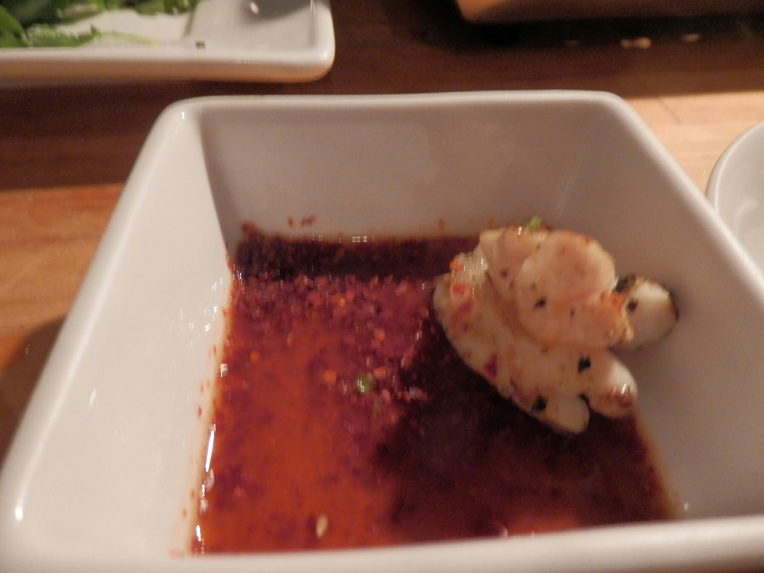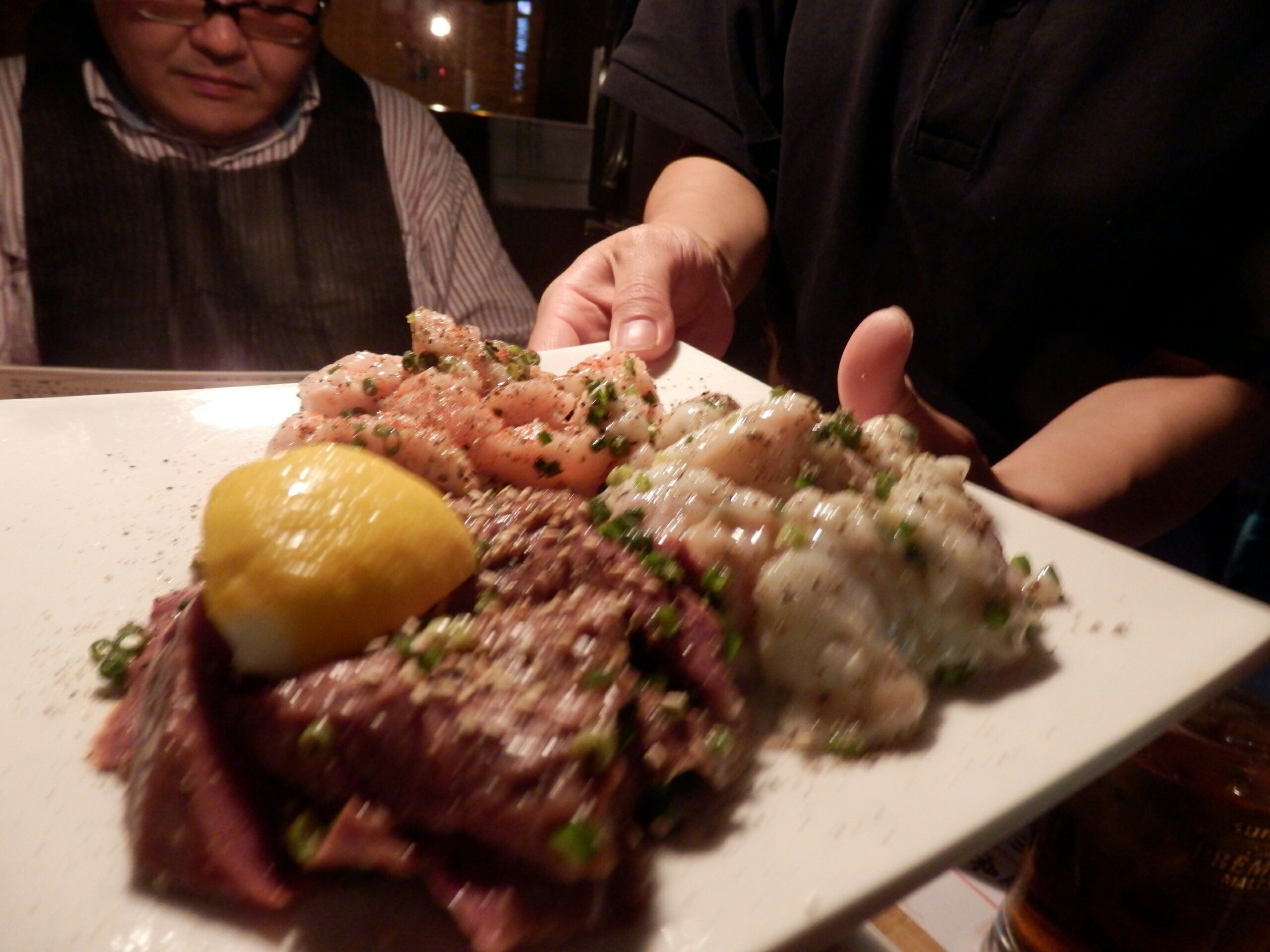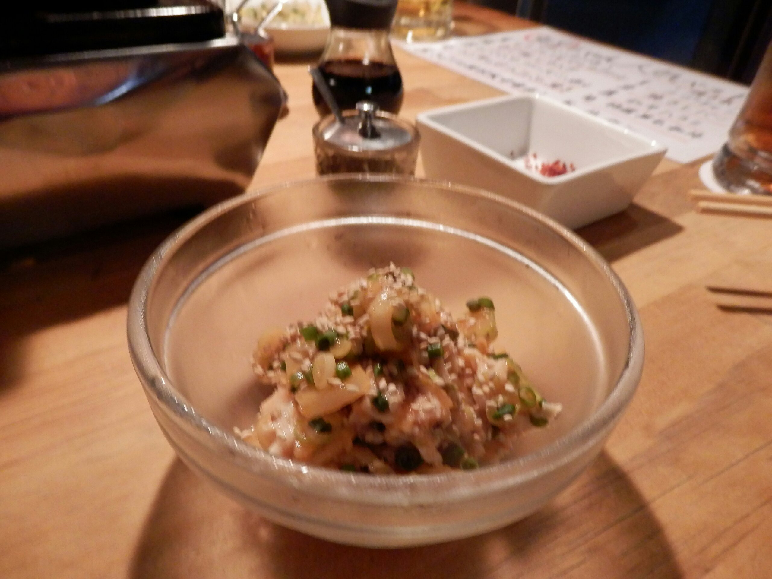 店員さんからオススメを教えてもらった中で注文した生の肉のなんか?正式なメニューの名称は覚えてません。写真では5切れしかありませんが、これは私が思わず一切れ食べてしまったためで最初は6切れでした。あまりのおいしさに感動。4人で6切れだったので、あとでまた頼もうと決意。でも結局いろいろ頼んでお腹いっぱいで結局一切れしか食べられなかったのが残念です。