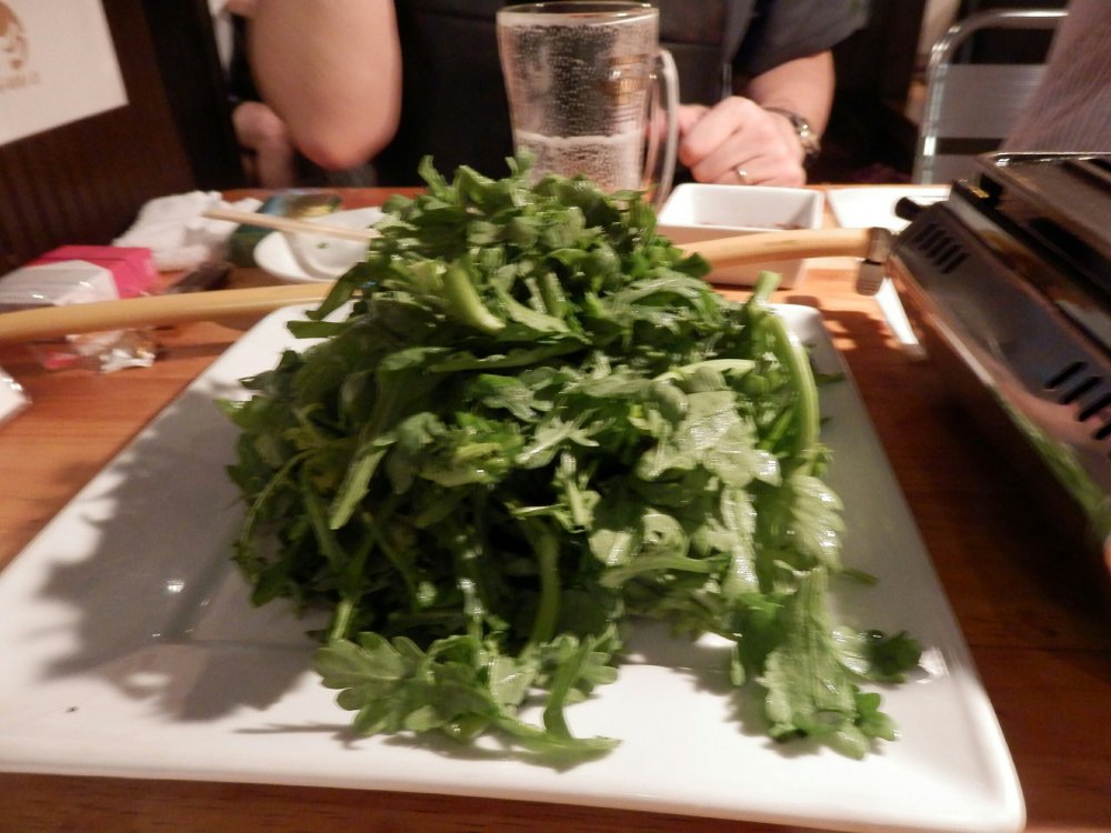 これは、焼き物を頼むと自動的について来る春菊のサラダです。盛り沢山なのであとは心置きなく肉を頼めます。味付けはあっさりで酸味のあるドレッシグがかかってます。春菊独特の苦みはあんまり感じませんね。