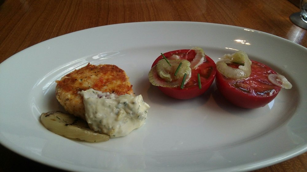 実際にはそれぞれ人数分を盛り合わせて出てきて、テーブルで自分のさらに盛りつけます。上の写真は自分用に盛りつけたものです。フルーツトマトもクラブケーキもどちらもおいしいです。レムラードソースって食べたことありませんでしたが、タルタルっぽいのかな?マヨネーズがベースのような感じ?
