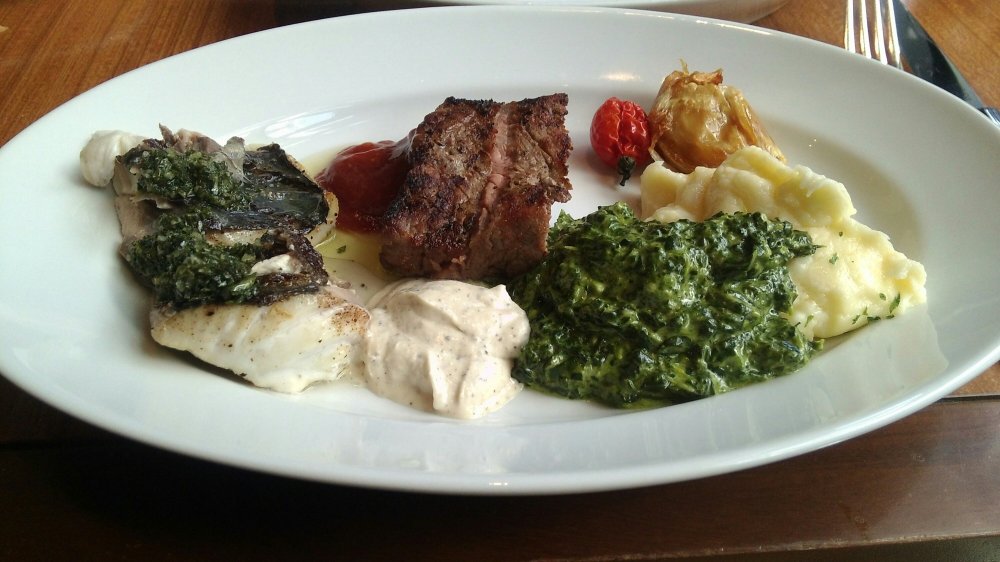左が魚で魚用のソースをかけてあります。手前はステーキ用のソース、ほうれん草のクリーム煮、マッシュポテト、奥がステーキでステーキの左側に見える赤いのはステーキ用のバーベキューソースです。