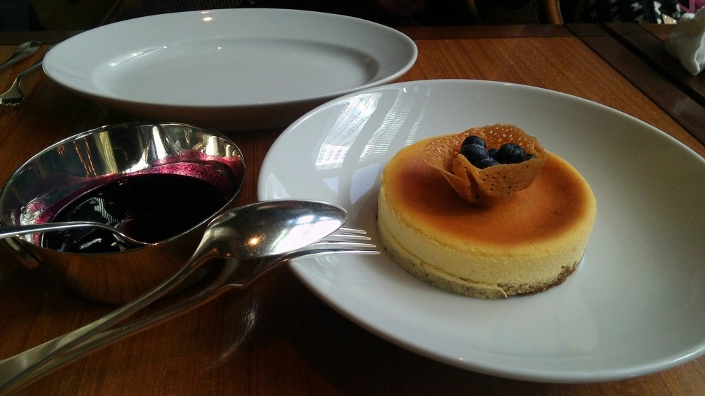 最後がデザートです。この写真だと小さく見えますが、直径15cmくらい。これだけなら二人分なのでちょうどいいくらい。ただ左側に見えるブルーベリーのソースの量がかなりあってしかも相当甘いので、これを全部かけて食べると結構きます。このあたりの甘さと量の多さはちょっと外国風ですね。