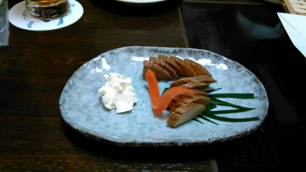 鶏の唐揚げで一気にお腹一杯になってしまったので休憩をかねた箸休めで時間をあけます。これはいぶりがっこ。マスカルポーネ付き。お酒にあう感じです。