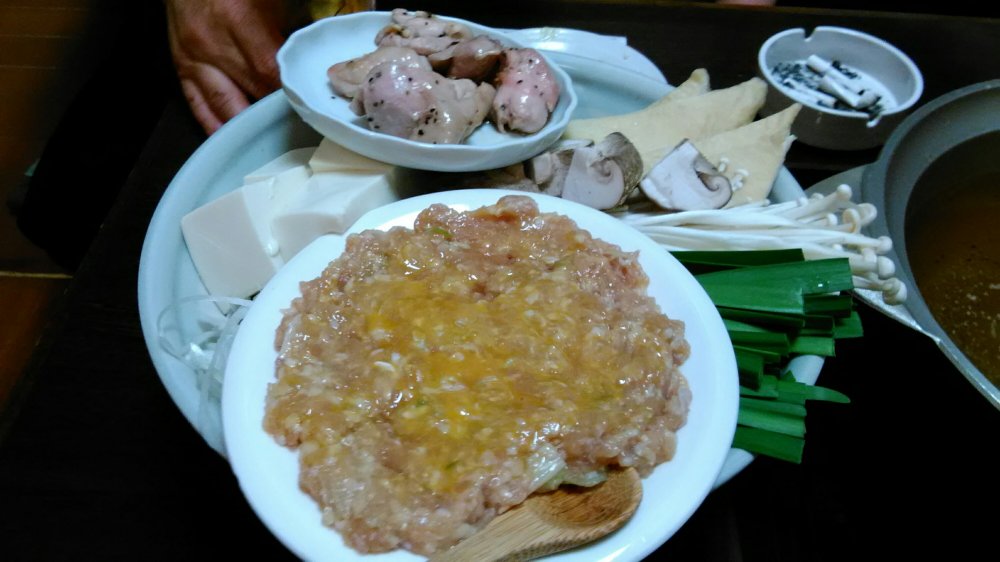 具材です。鶏肉、鶏つくね、豆腐に野菜です。これで二人前。