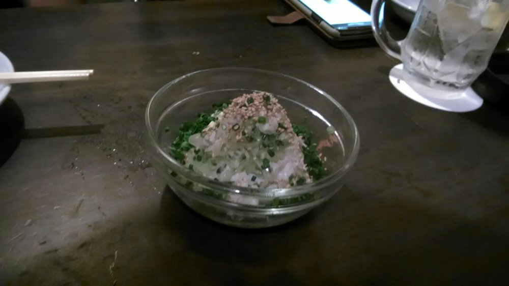 まずはお通しですが最初からかなり旨くてちょっと驚きです。味といい塩加減といいいい塩梅です。大量の葱があり、ちまちましてないのもいいですね。