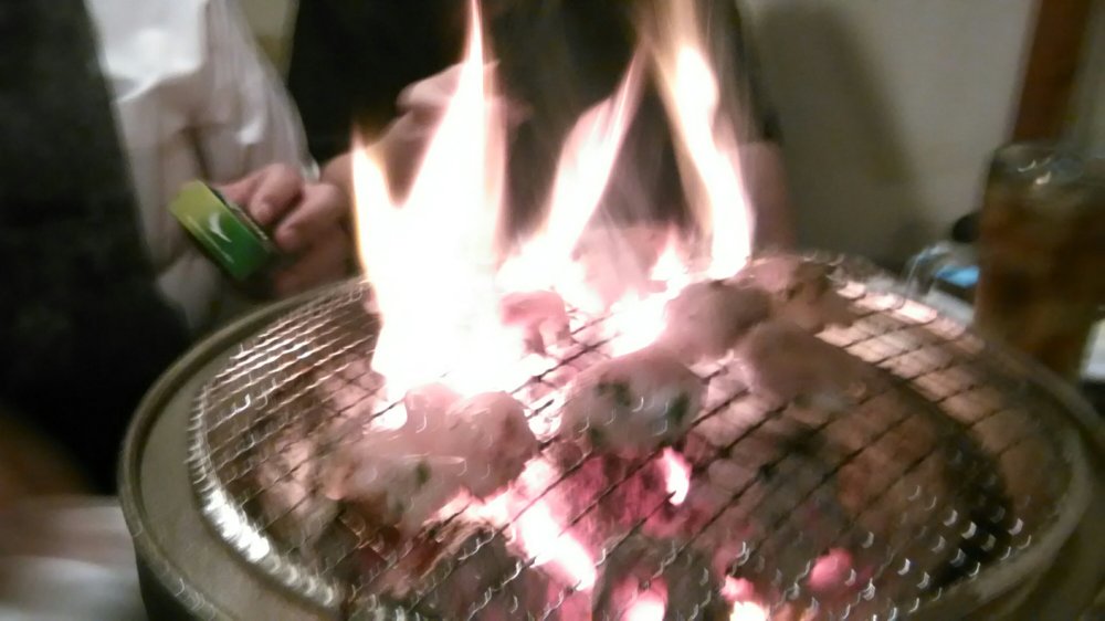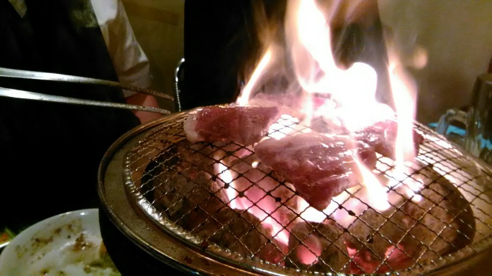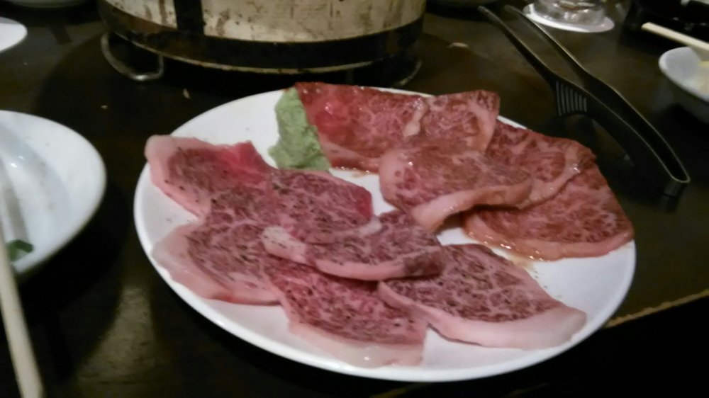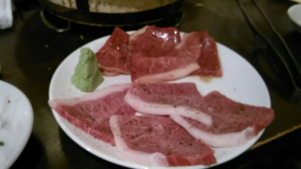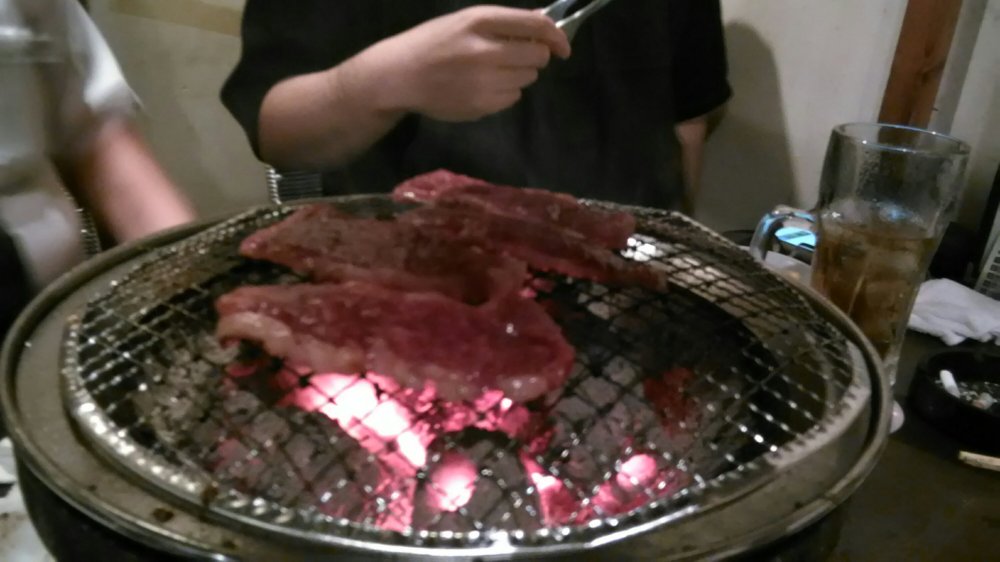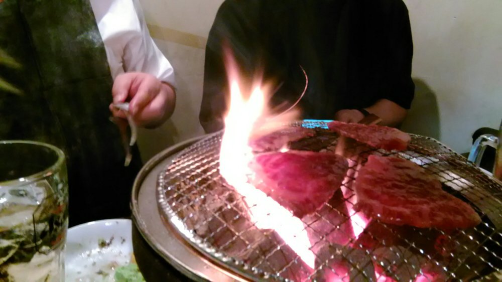 ただここで難点なのは、相当いい肉でさっとあぶって食べたいし、店員さんからもそういわれてるのですが、この焼き器の真上に煙り吸い込みようの換気装置が付いているため暗くて焼き具合が見えません。個人的には焼きすぎて堅くなったかなと。それでも元が柔らかいので堅くは感じませんが、本来もっと柔らかく味わえたはずと言うのが反省点です。