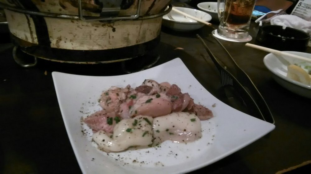つづいてホルモン。これは三ちゃん盛りといういくつかのホルモンの盛り合わせで、最初の頃に頼んだのですがようやく出てきました。4人には少なすぎですね。味は美味しいと思って値段を見ると、1490円。ここは美味しいけれどホルモンでも安くはないのです。