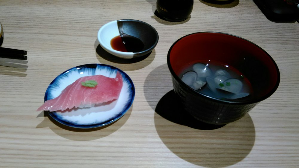 とろの握りににシジミの澄まし汁です。ちょっと珍しい感じですがなかなか美味しいです。