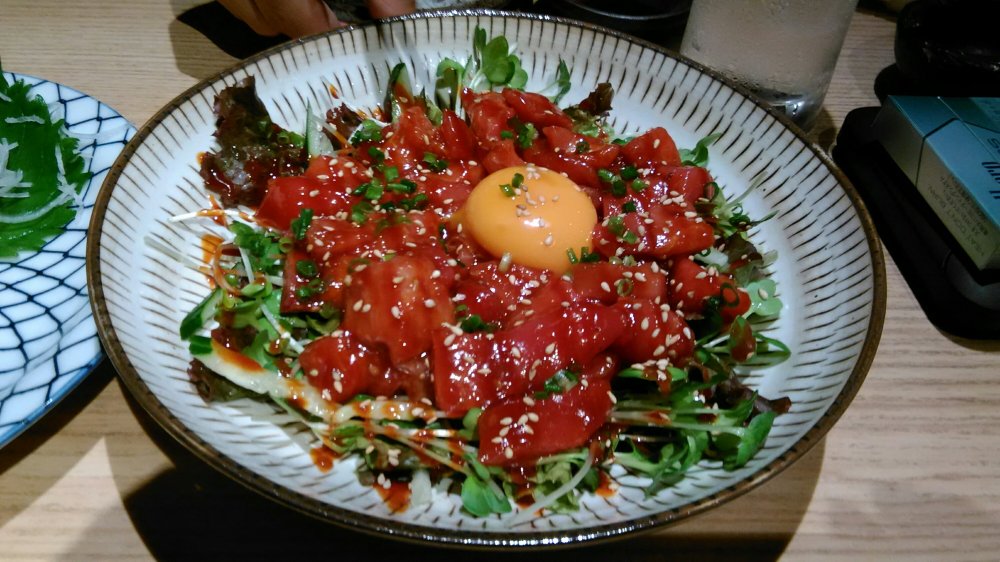 続いて鮪のユッケのサラダですが、ほぼ鮪ですね。味は結構美味しいです。意外と辛い。味はよいですが野菜を食べたい人には野菜が少ないかな