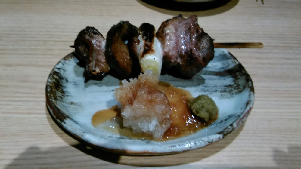 続いて鮪のねぎまの塩味です。大根下ろしにポン酢とゆずこしょうで食べます。 一応塩だけでも食べてみましたが、ポン酢がたいへんいい味で、ポン酢つけた方が断然美味しかったです。