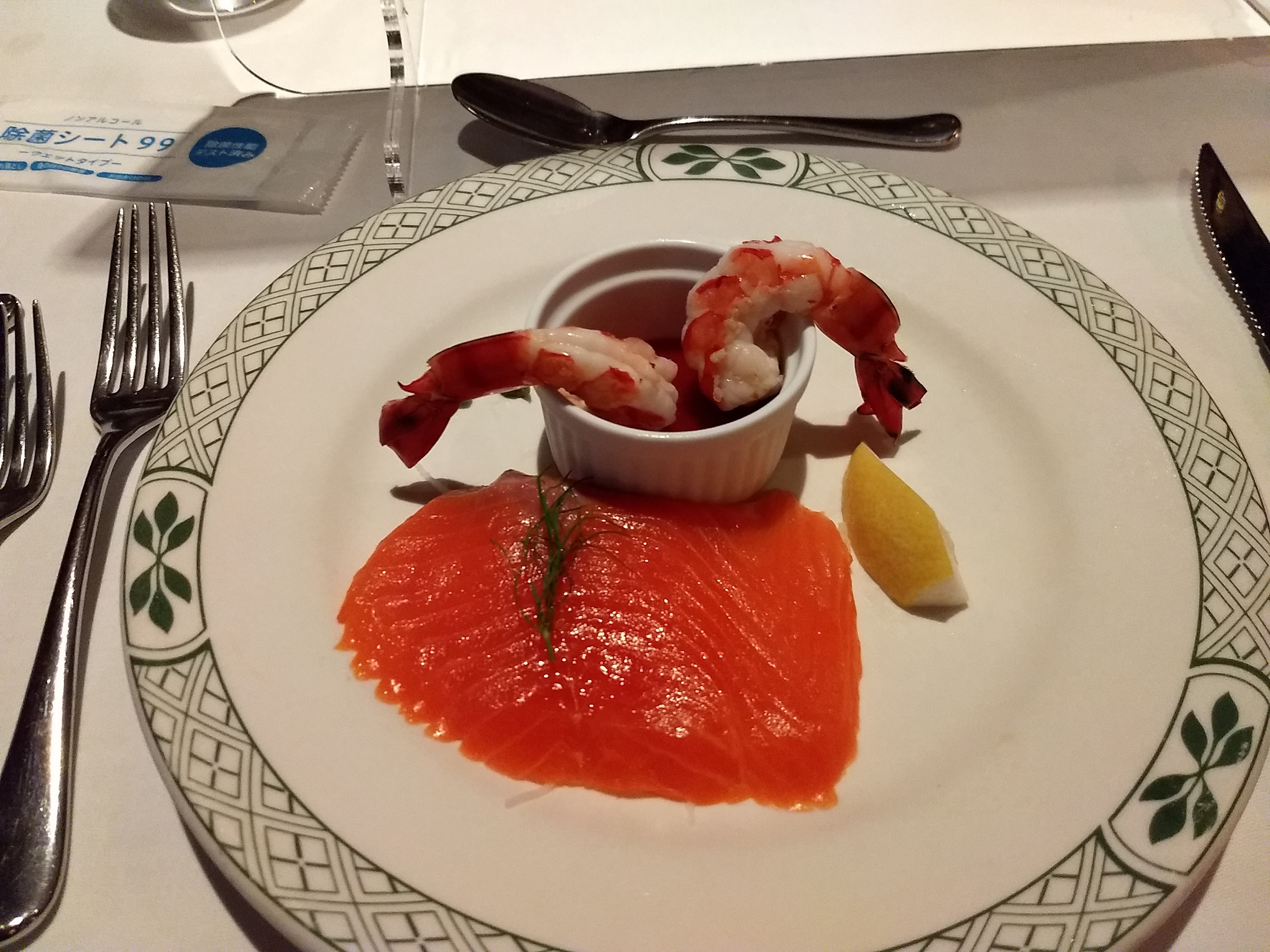 サーモンは意外と肉厚があり、海老もおいしくてしかもそれなりに量があります。この辺りは日本料理の突出し(先付けと呼ぶべきか?)とはかなり意味合いが違うのでしょうが、満足感もあります。