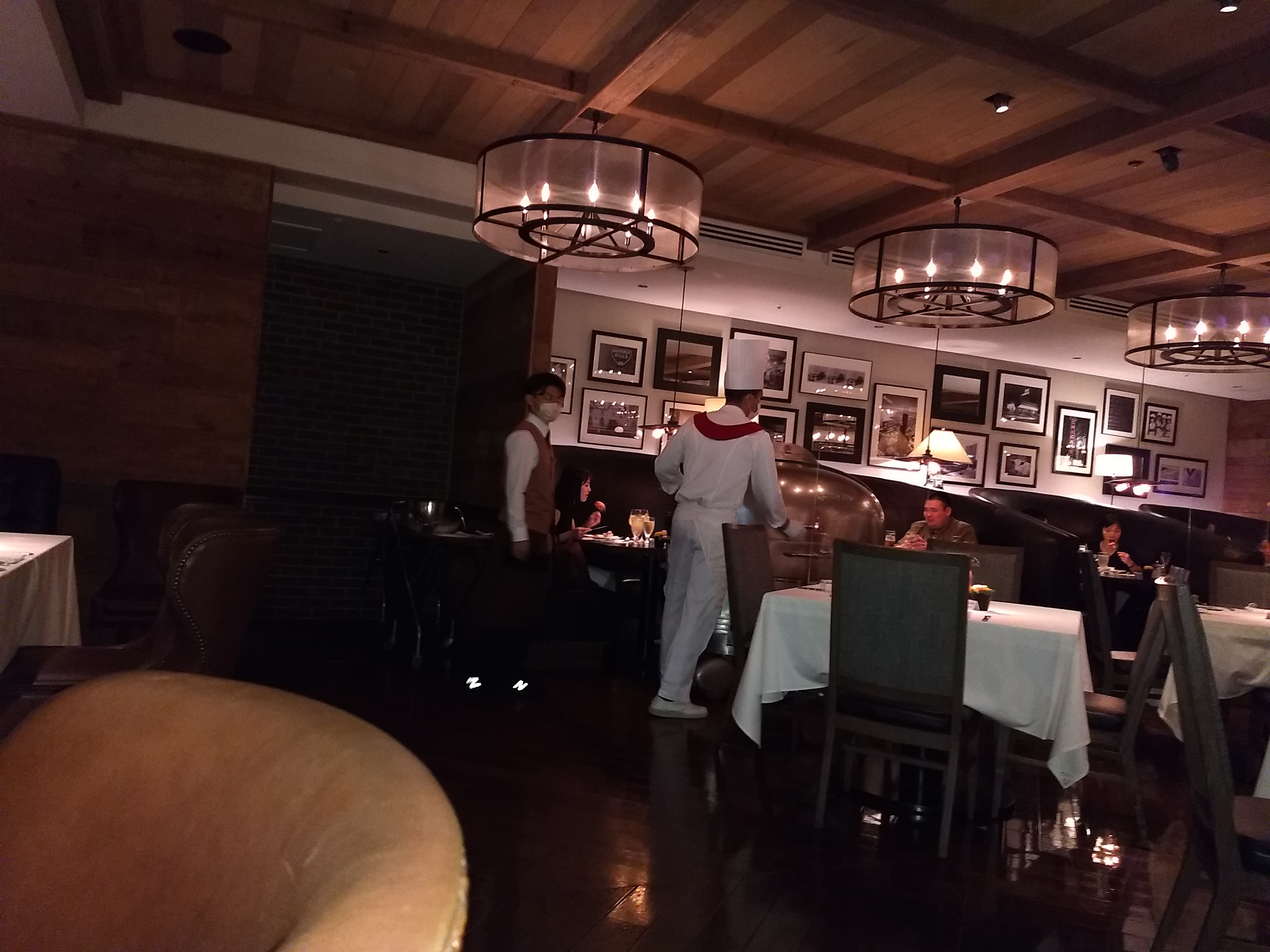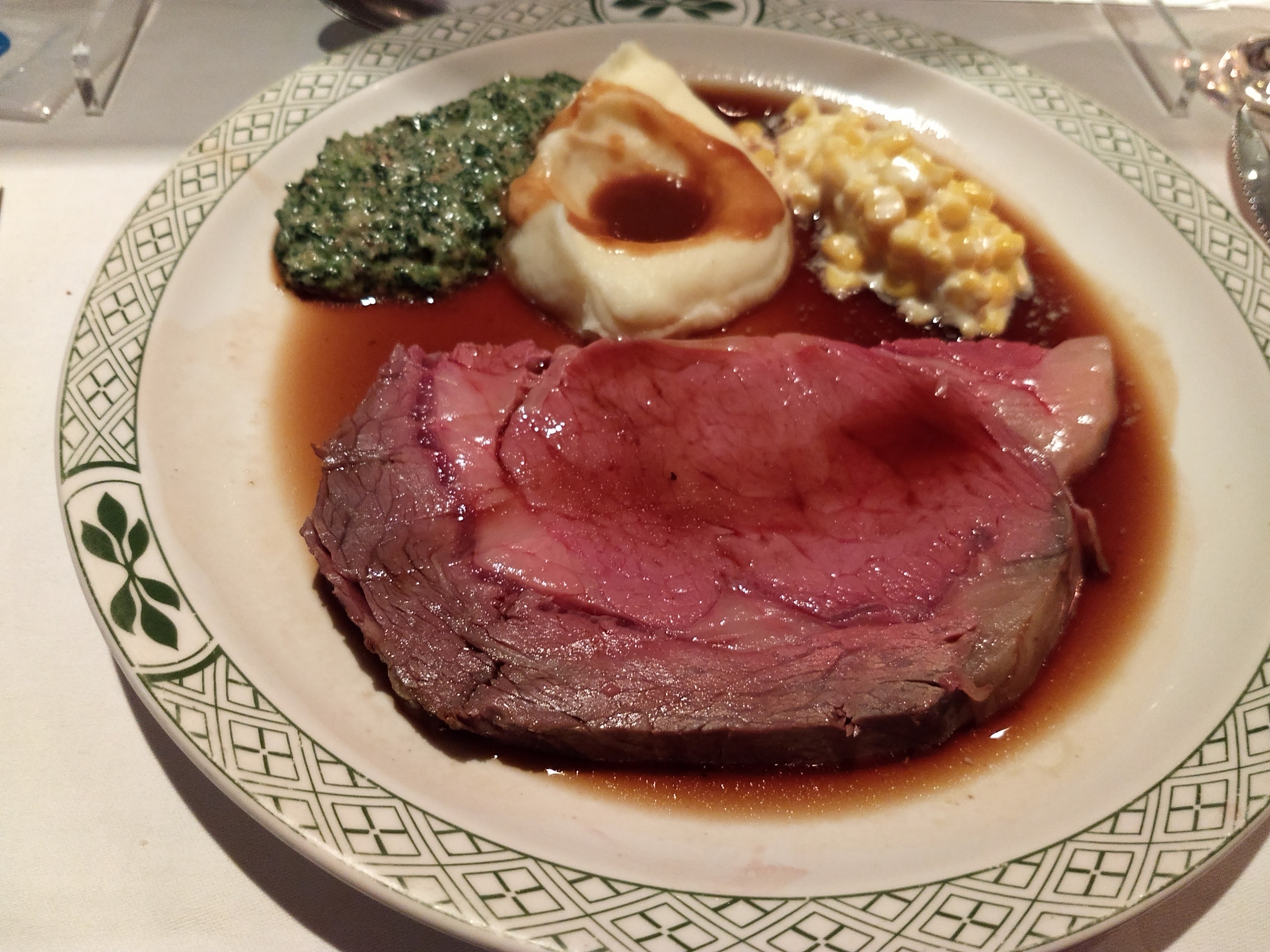 当初はこんな感じで、後でヨークシャープディングが追加されて一番最初の写真のようになります。肉はさすがに相当柔らかい。結構美味。またステーキよりも中まであったかい気がする。ほうれん草はWolfgang’s のよりもうまいと思った。(好みによるでしょうが。)同行したほかの人も同じこと言っていたので良いという事は確かと思います。ソースの量が多すぎるというか、このソースは結構味が濃いからそれほどからませなくてもいい。個人的には、ステーキよりも好きかもしれない。全般的に値段の割に質が高いお買い得な店だと思う。周りでは誕生日を祝ってお店の特別なサービスがされているテーブルが多々あって、そのあたりはWolfgang’sと似ている。