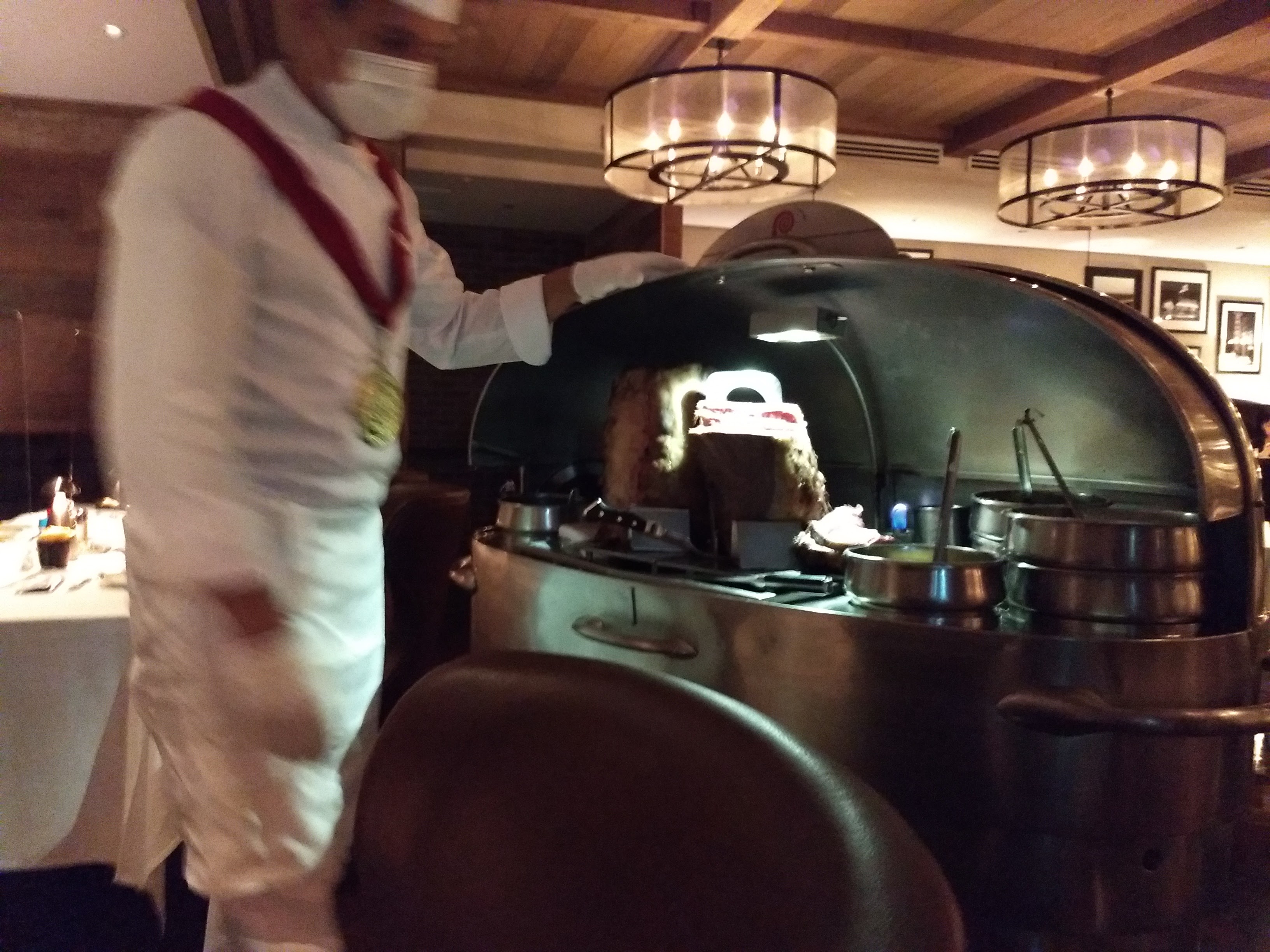 いよいよローストビーフです。このシェフが切り分けてサーブしてくれます。シェフはメダルを下げていますが、どうやらこの作業は誰でもが行えるものではないようです。確かに、注文したグラム数を的確に切り分けなければならないのですし、もしかすると彼は切り分けるだけでなく、この塊の肉を調理した本人なのかもしれません。調理した本人が自ら切り分けるということをアピールしているのかも。もっとも詳しくはわかりませんが。