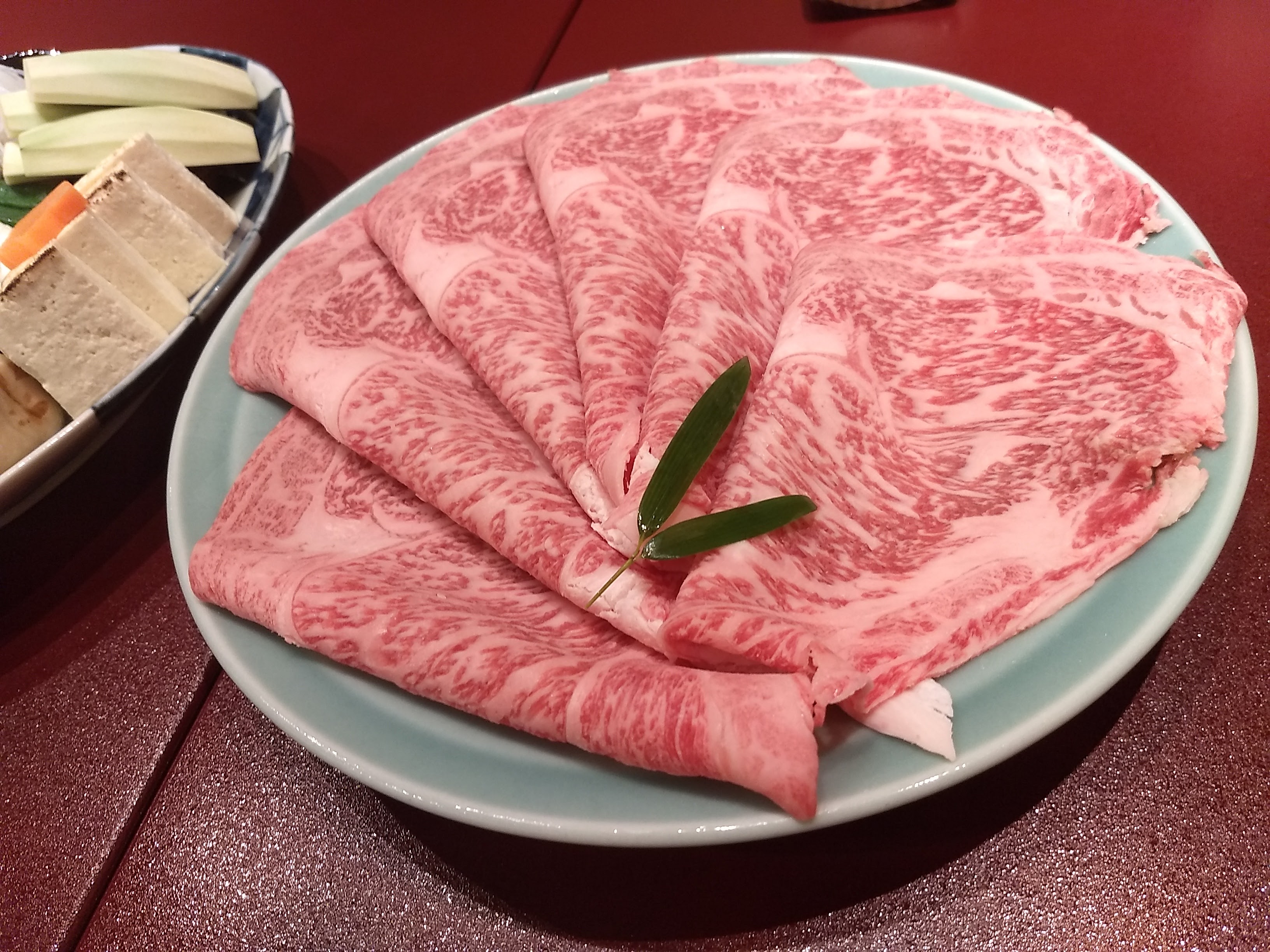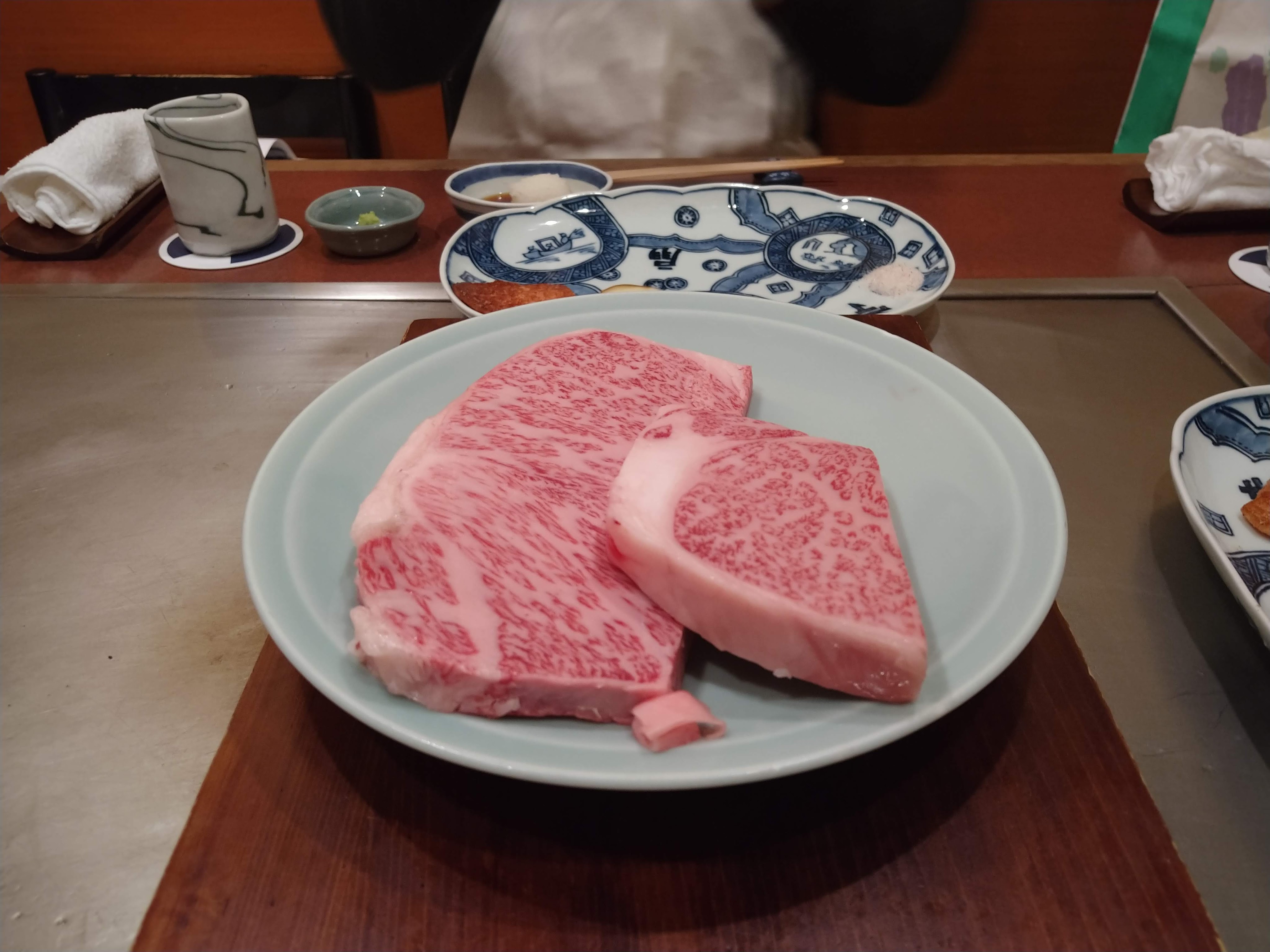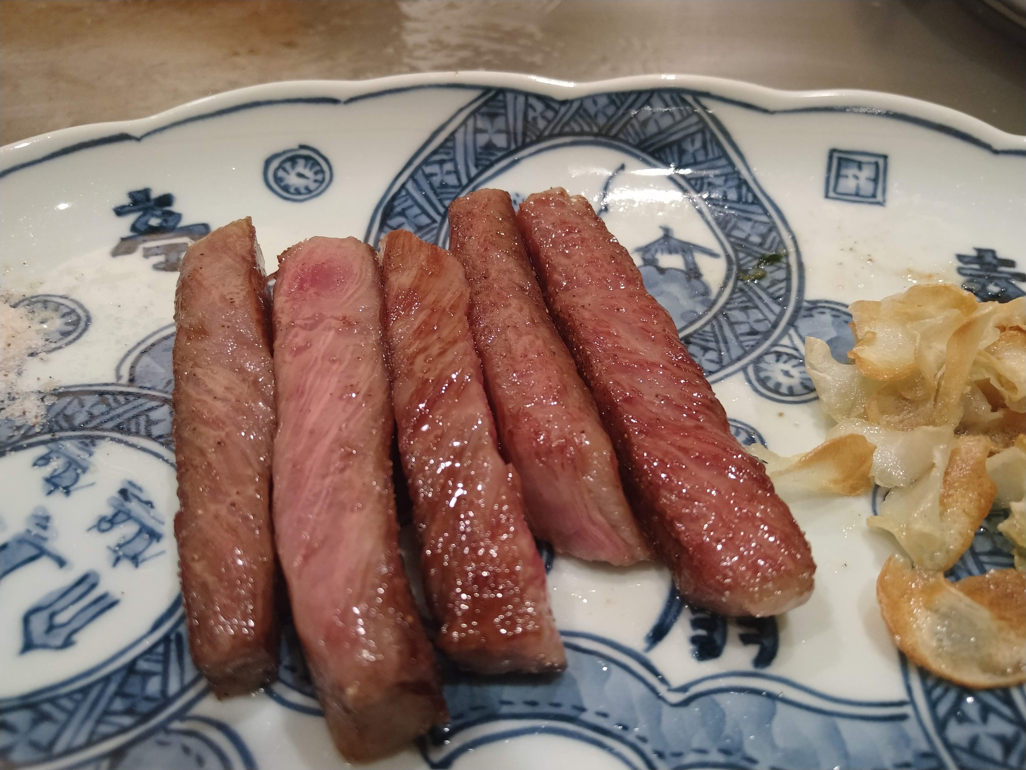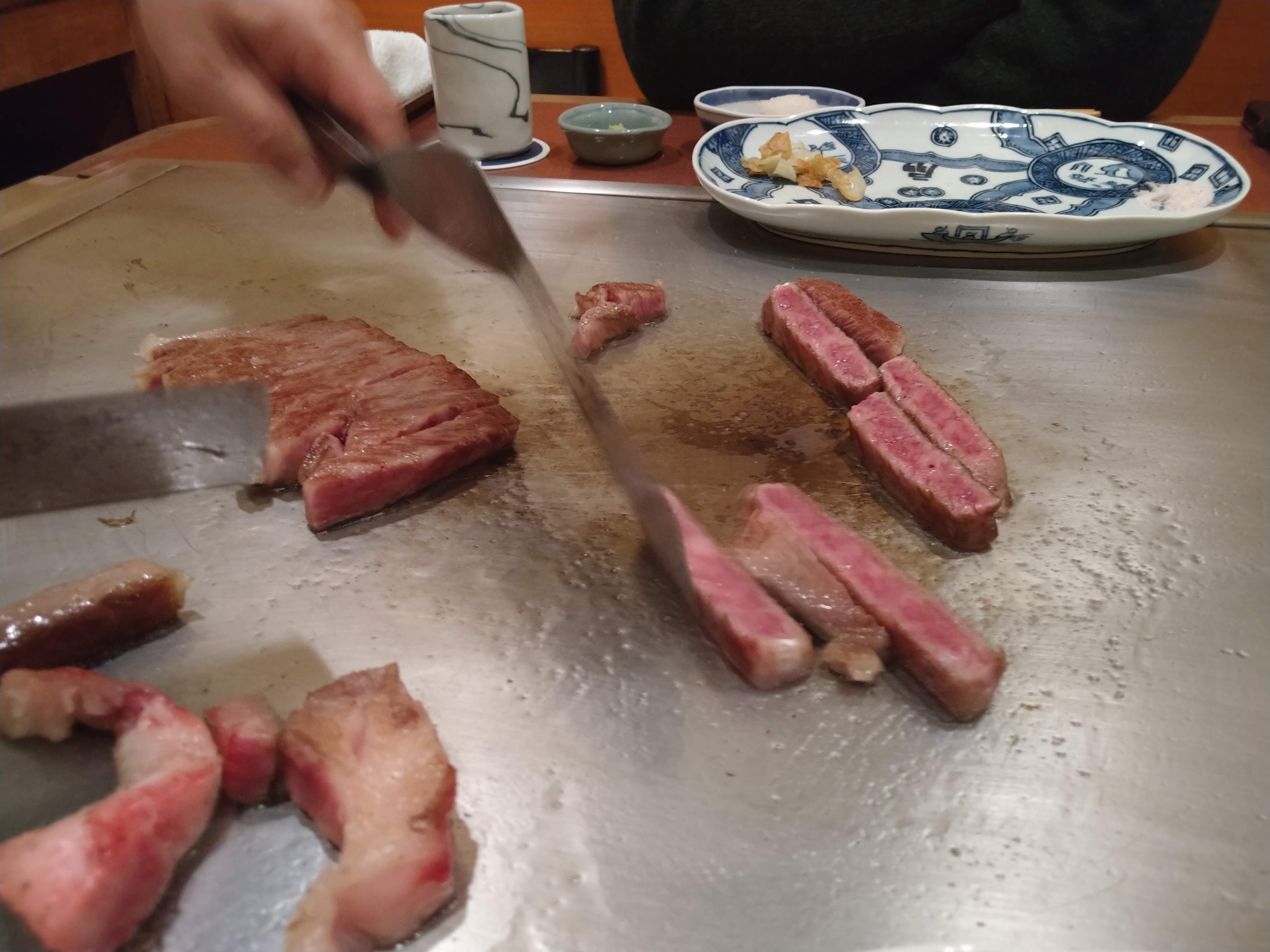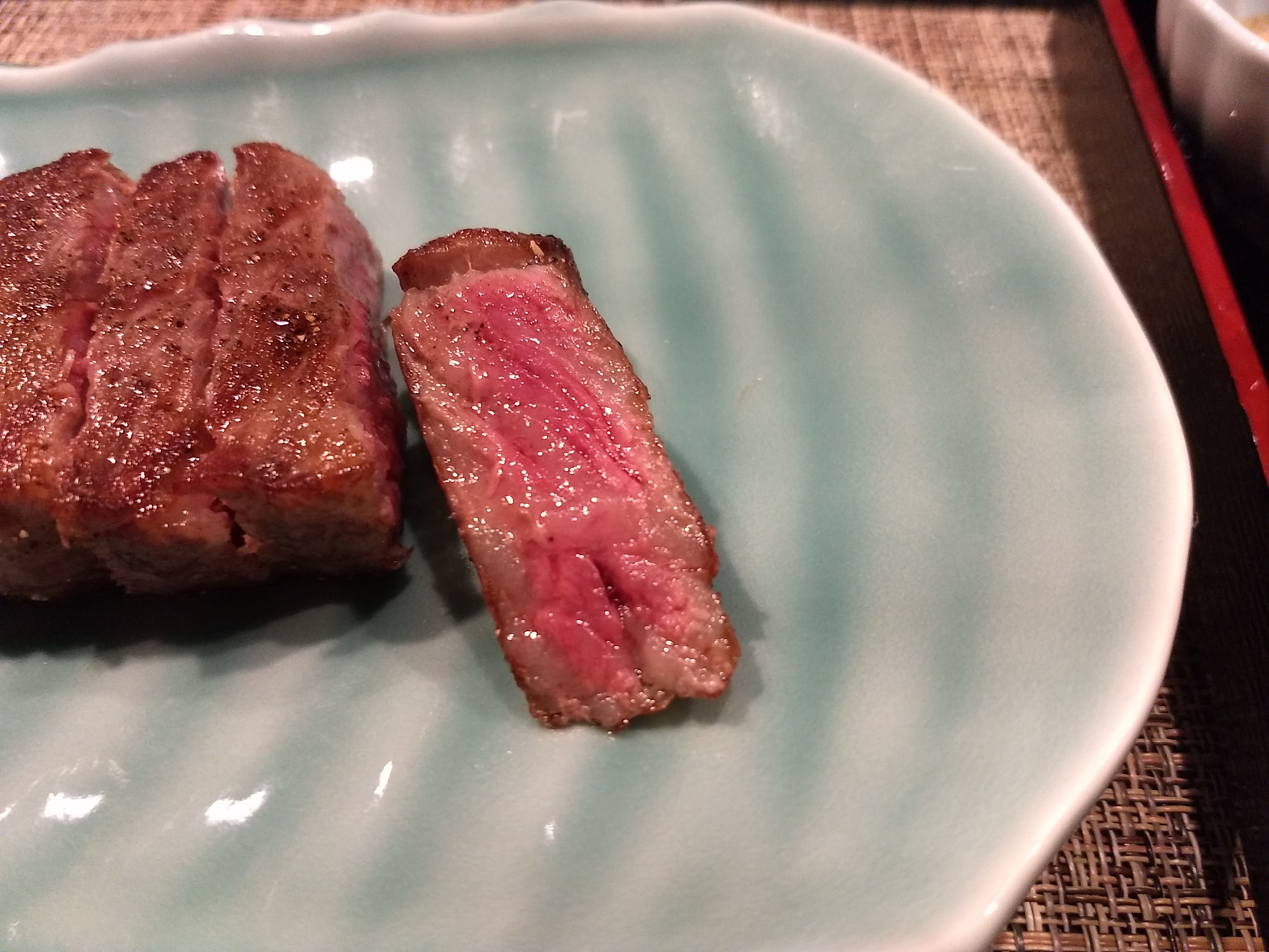 別の鉄板焼きで食べた肉の断面の写真を張り付けましたが、それと比べると今回の方は肉にかなりさしが入っているのが分かります。食べた感じも今回の方が脂がのっていて柔らかいです。