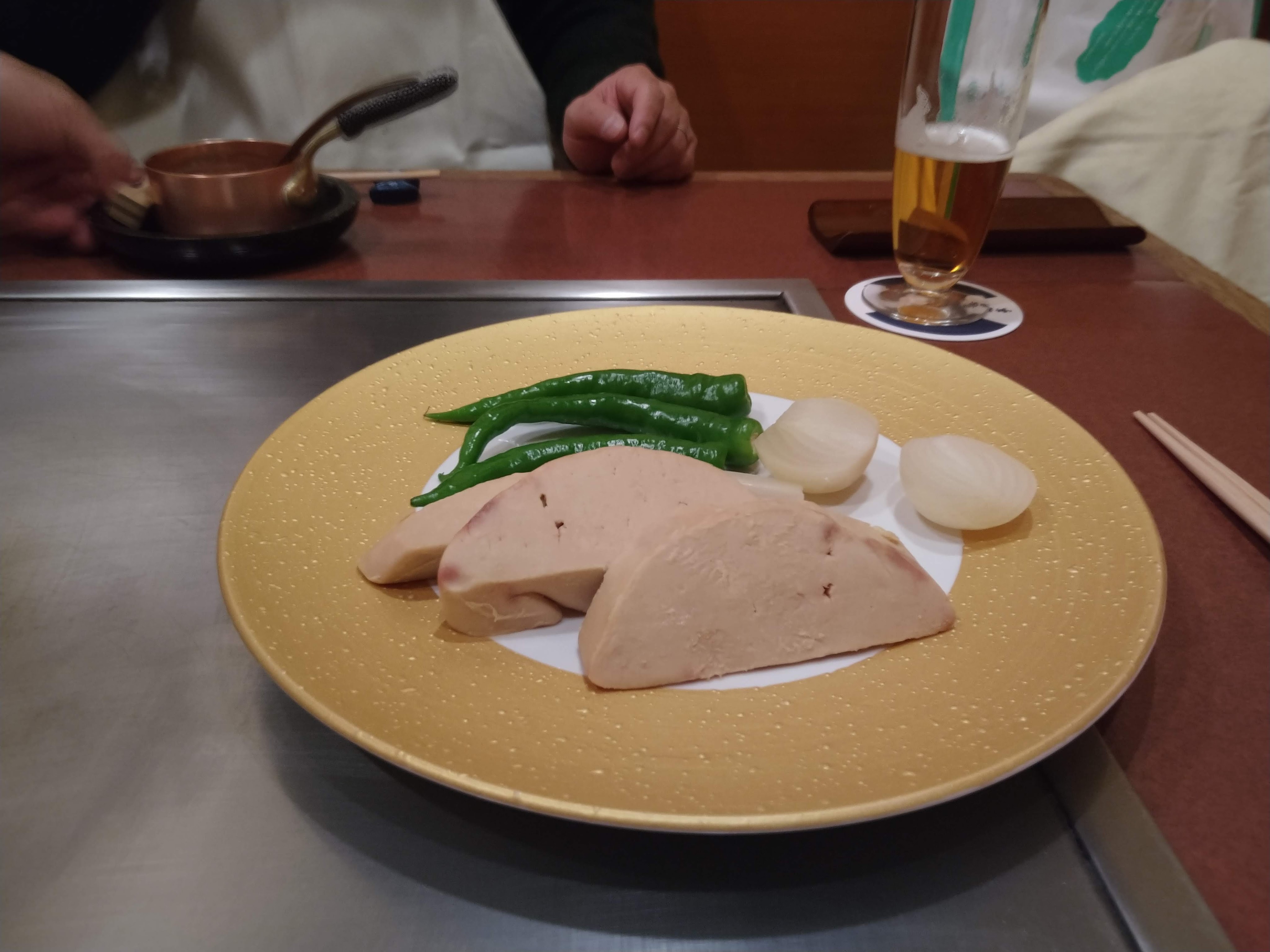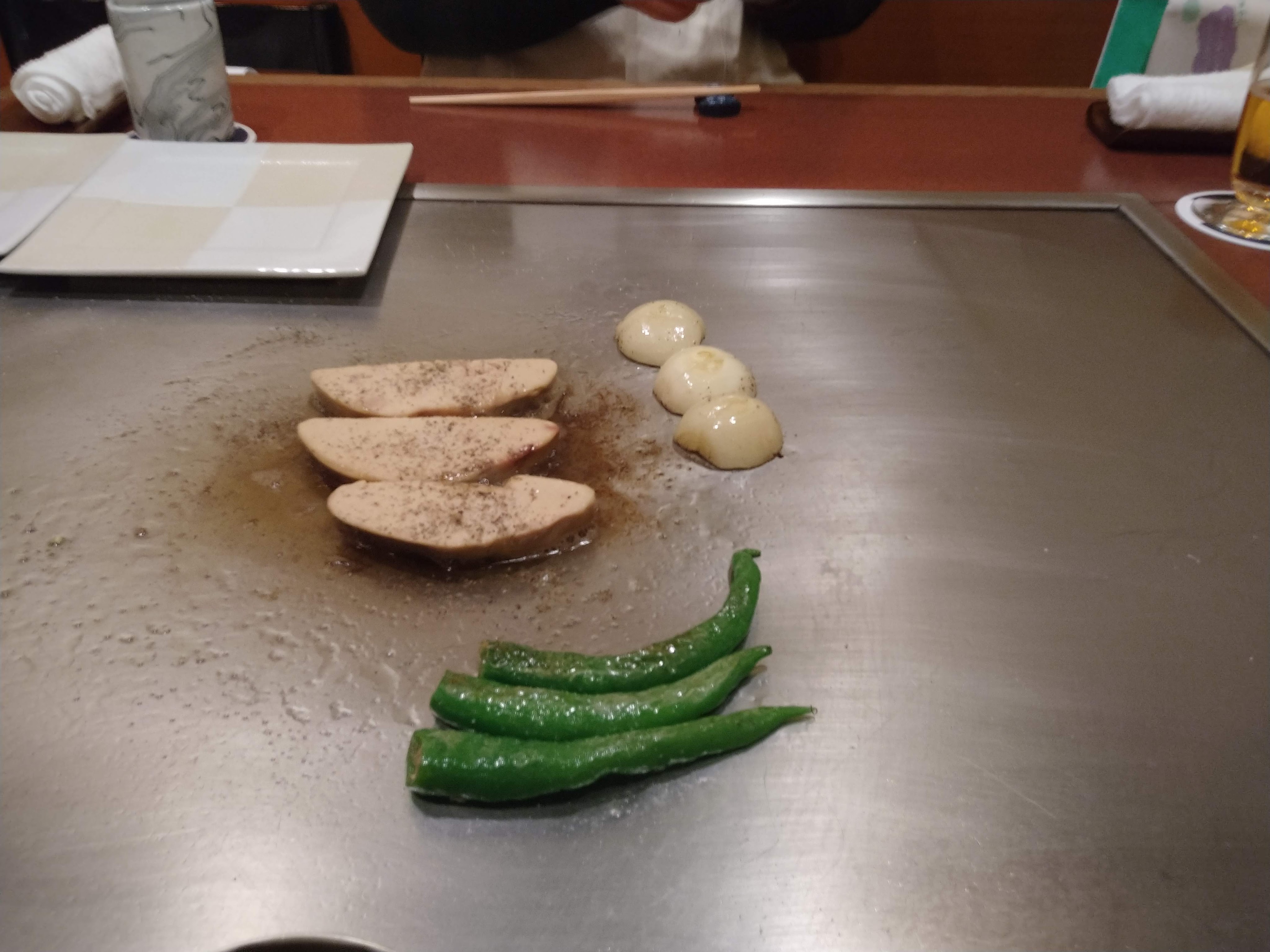 フォアグラに唐辛子と玉ねぎ。バルサミコソースがかかっているが、正直塩気が私には足りない気がした。これは人によるから作る方は大変だ。