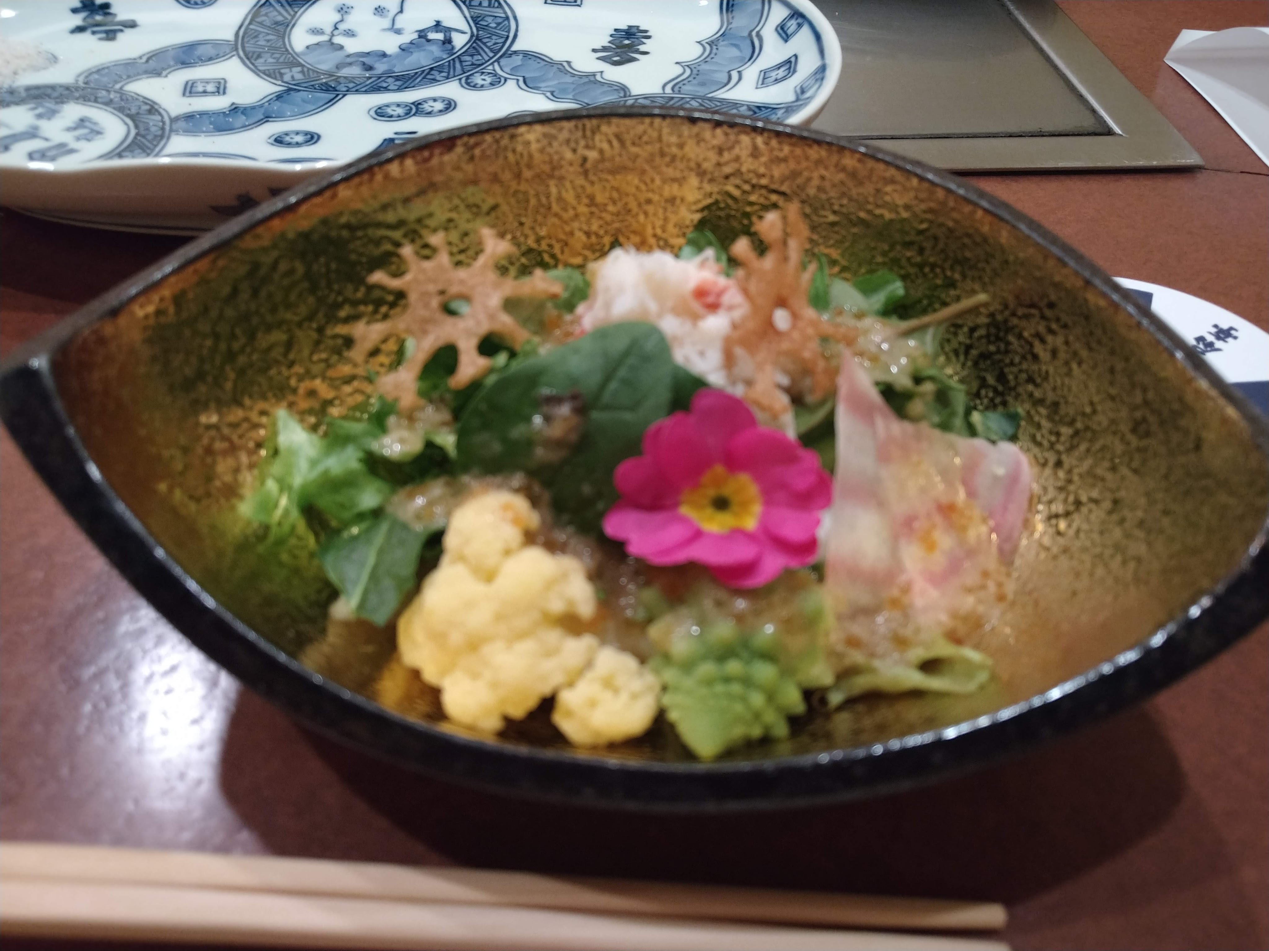 このサラダは非常においしい。花びらまで食べられるそうだが、たべると非常に柔らか。