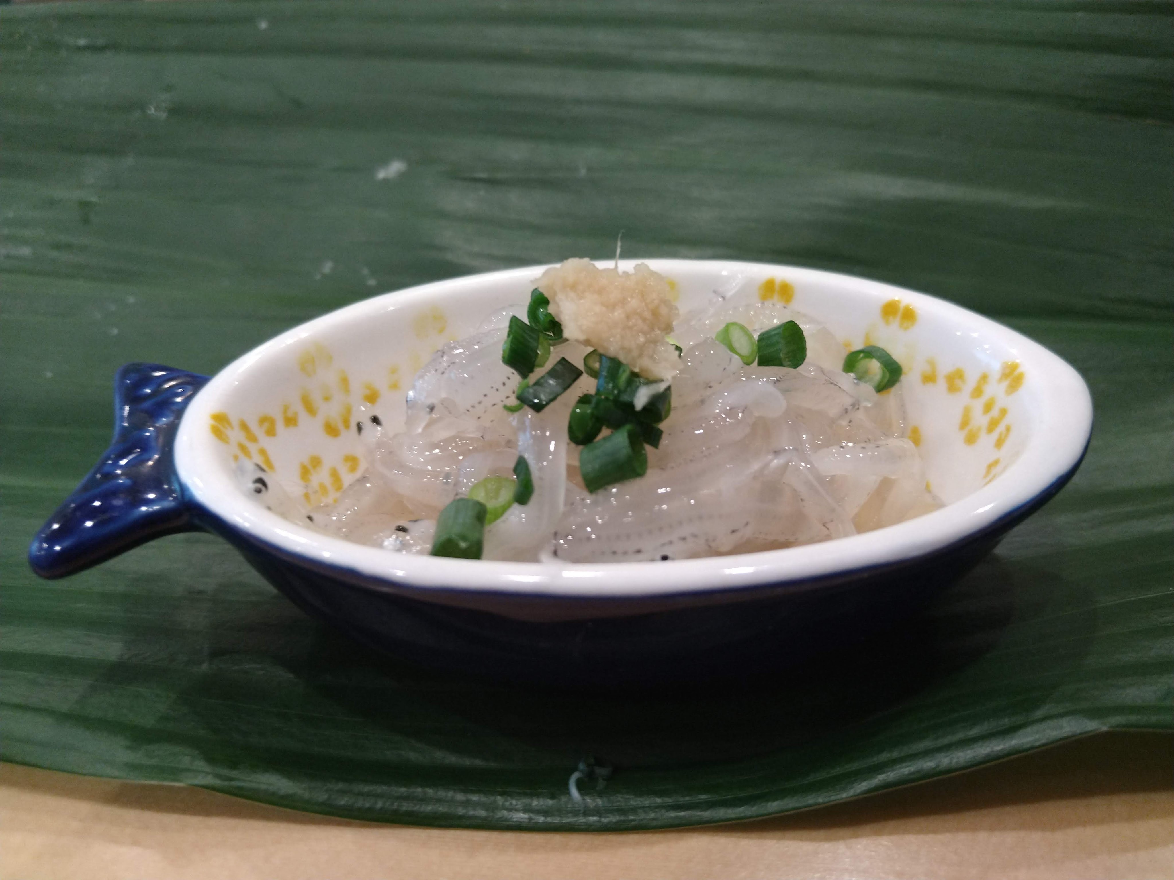 生の白魚ですが、これはサービスとか言われました。醤油を少し欠けて食べてくださいとのこと。今までお寿司屋さんで生のシラスを何度か食べていましたがその時はそれほどおいしいと思いませんでした。シラスと白魚は全然別のようですが、これは非常においしい。驚きました。