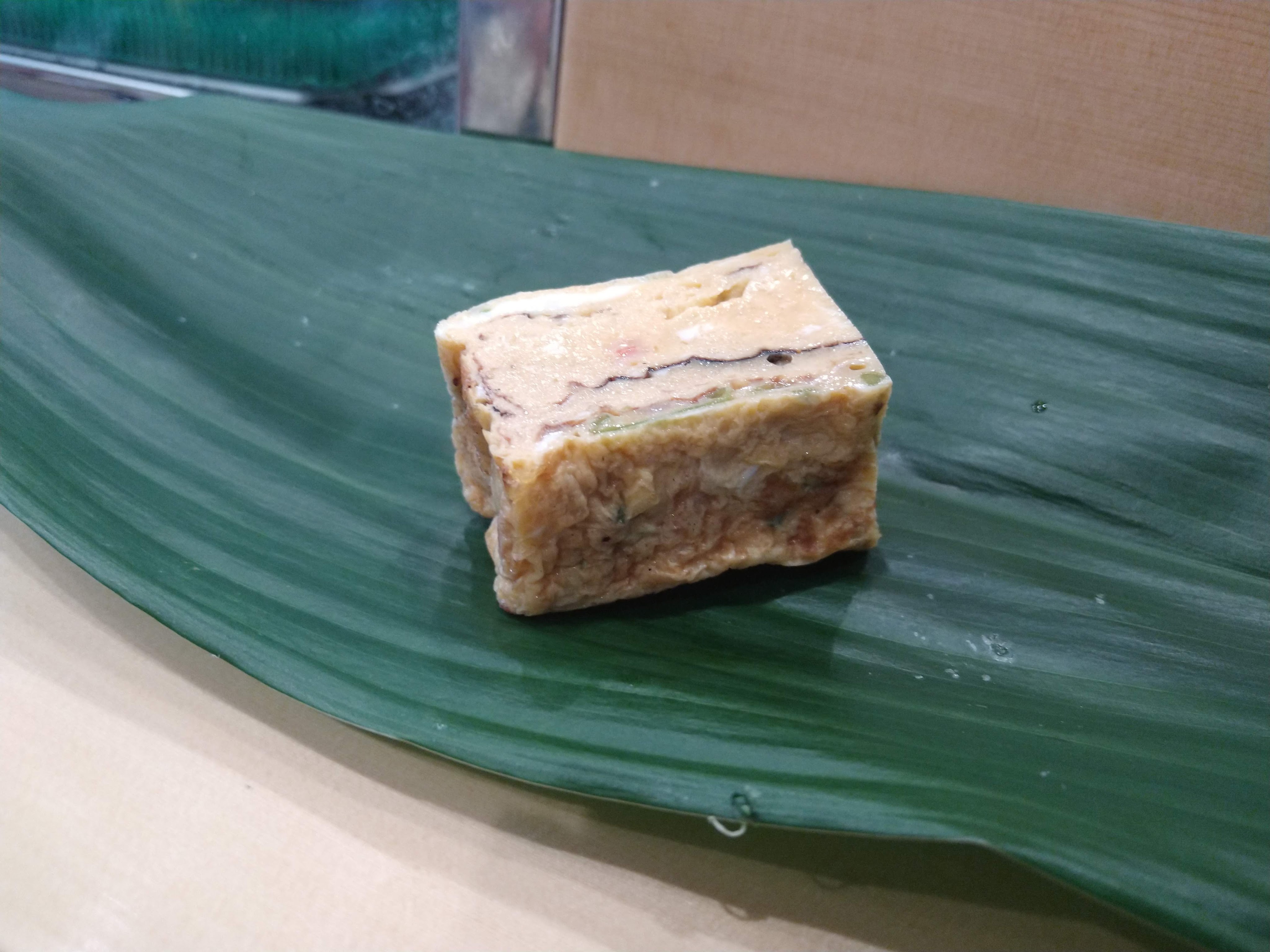 これは卵焼き。寿司大とはちがってあったかいものではありません。みるといろいろ入っているようですがちょっとなんだかわかりませんでした。どちらの店もですが、一般的な築地場外とか普通のすし屋さんの卵焼きとはだいぶ違います。