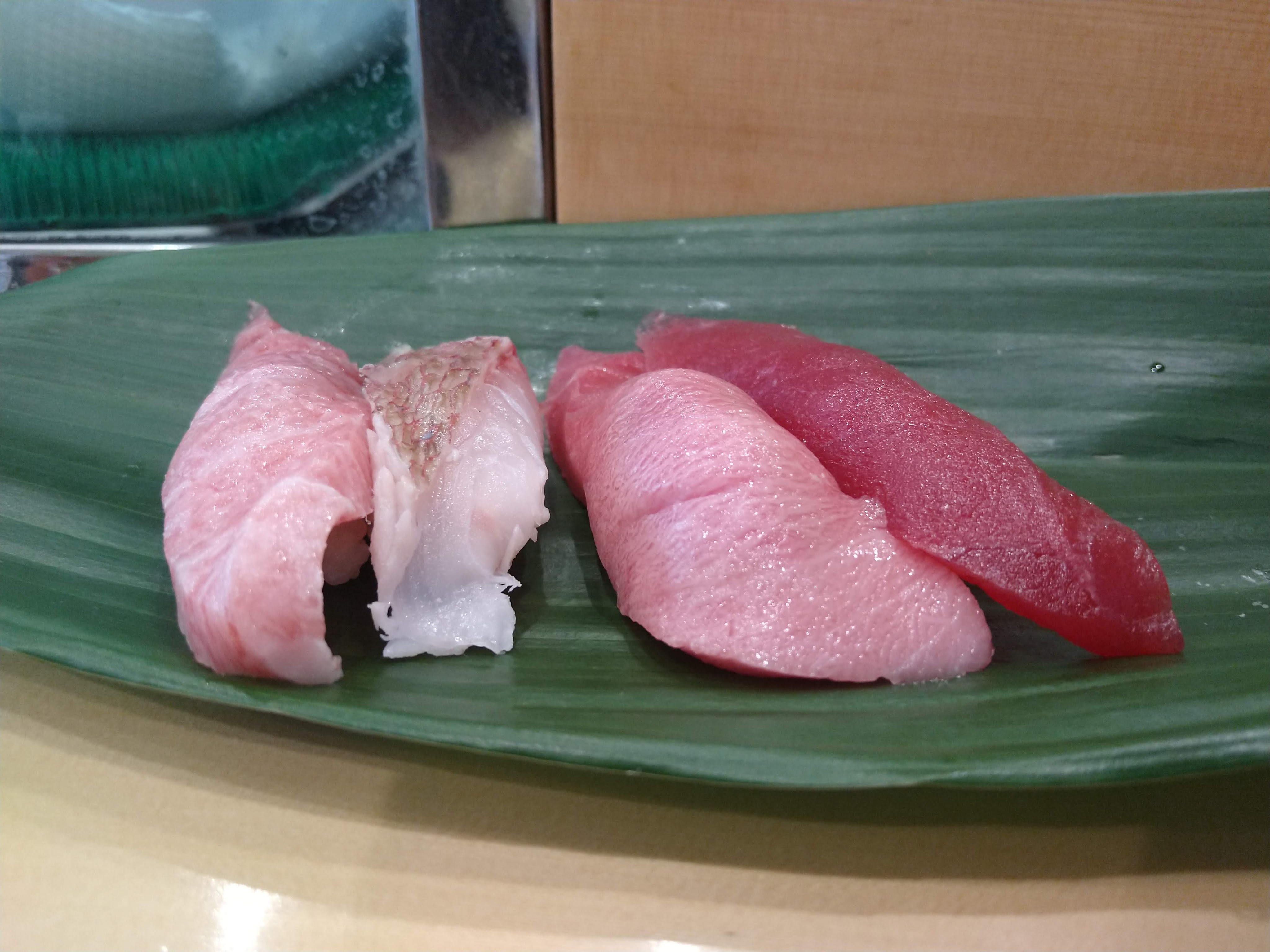 いきなりメインともいえるネタ登場です。右から赤身、中トロ、真鯛、大トロ。写真で見るとわかりませんが、シャリがすごく小さいです。1.5㎝くらい?おかげでたくさん食べられます。この赤身は非常においしかった。赤身でうまいと思ったのは初めて。中トロ、大トロ、ともに大満足。真鯛は天然って言ってました。ここはほとんどは醤油をつけて食べるようです。どれもシャリが小さくネタは厚みがあって食べ応えあります。