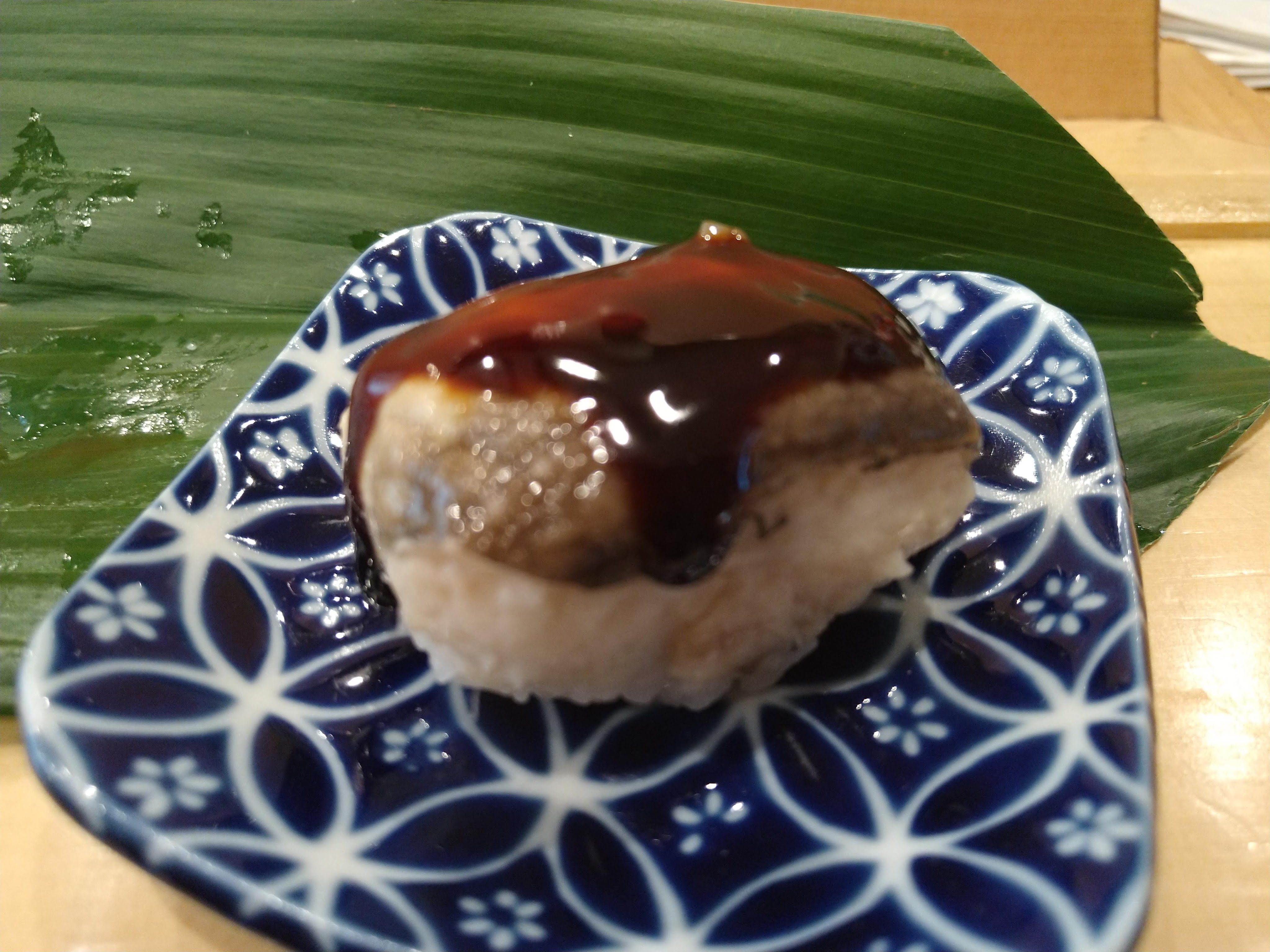 寄りすぎてピントが全体にあっていませんが、煮あなごです。これは非常に柔らかいので口を近づけて食べてくれと言われましたが、確かにめちゃくちゃ柔らかい。皿を口につけて食べました。それとこのツメはかなり濃い。これぞ江戸前か?