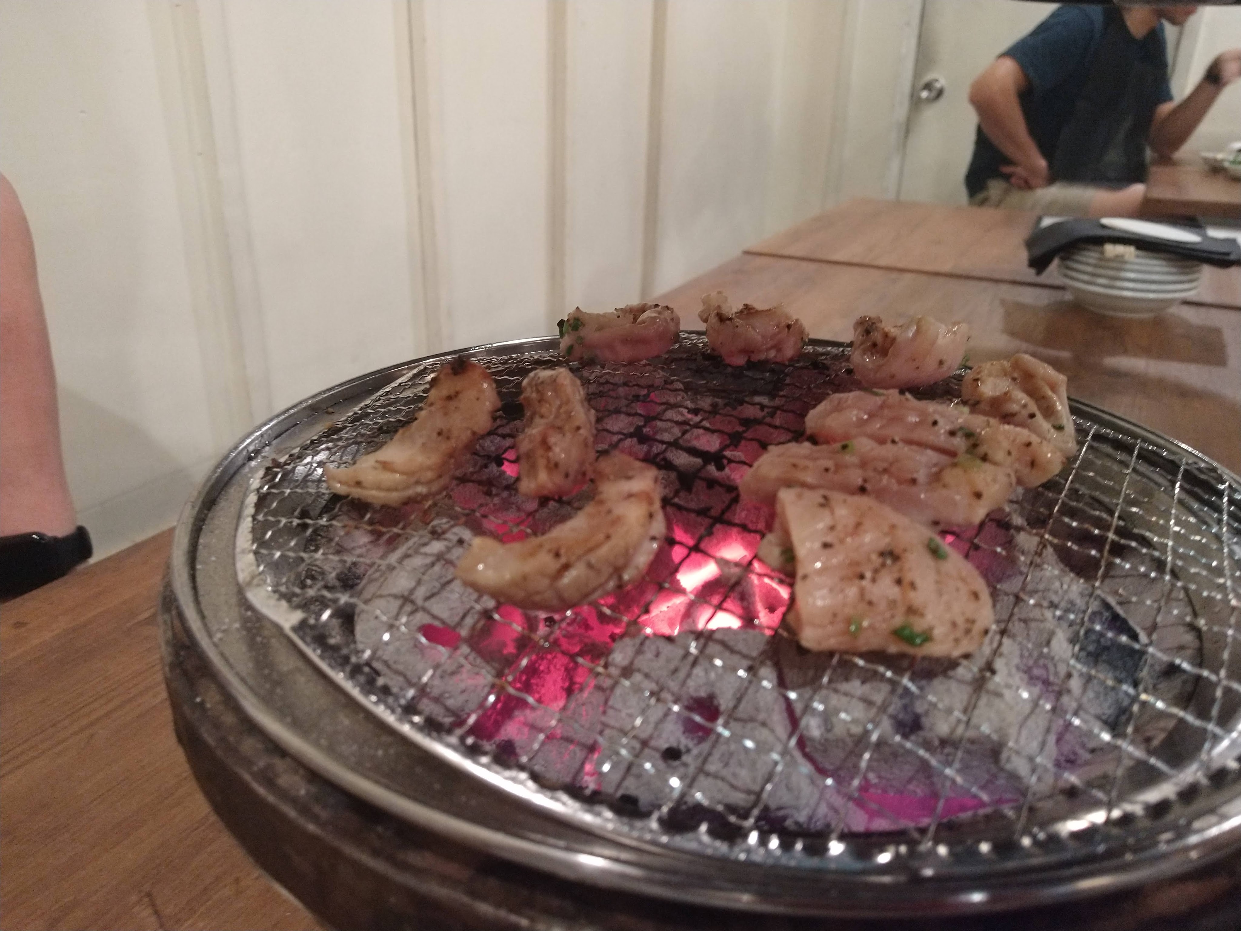 三ちゃんは好ちゃんとは異なり炭火です。隣のテーブルは空いていますが、この日は金曜の夕方という事もあり、この隣のテーブル以外はすべて埋まっていて混んでいます。