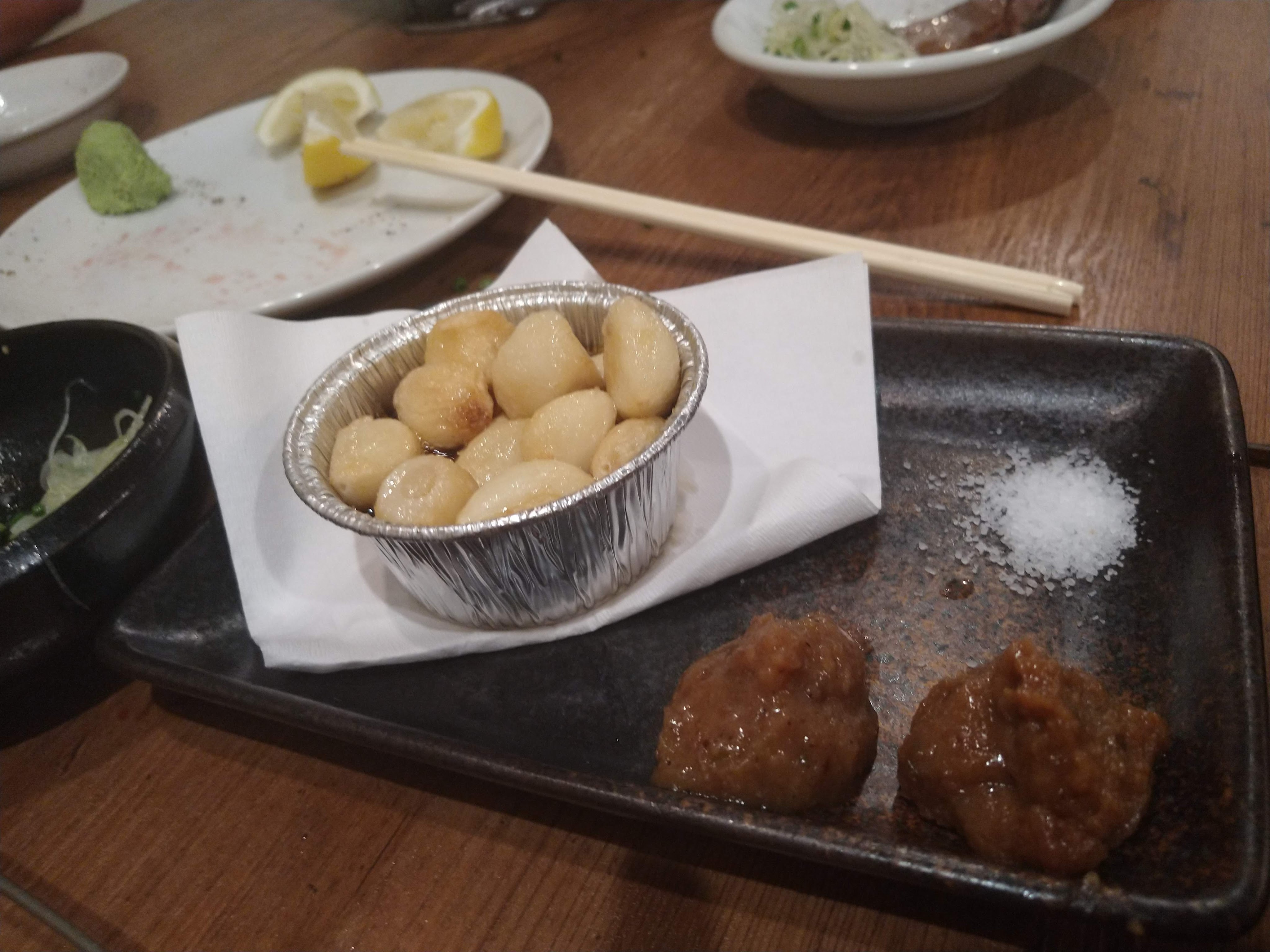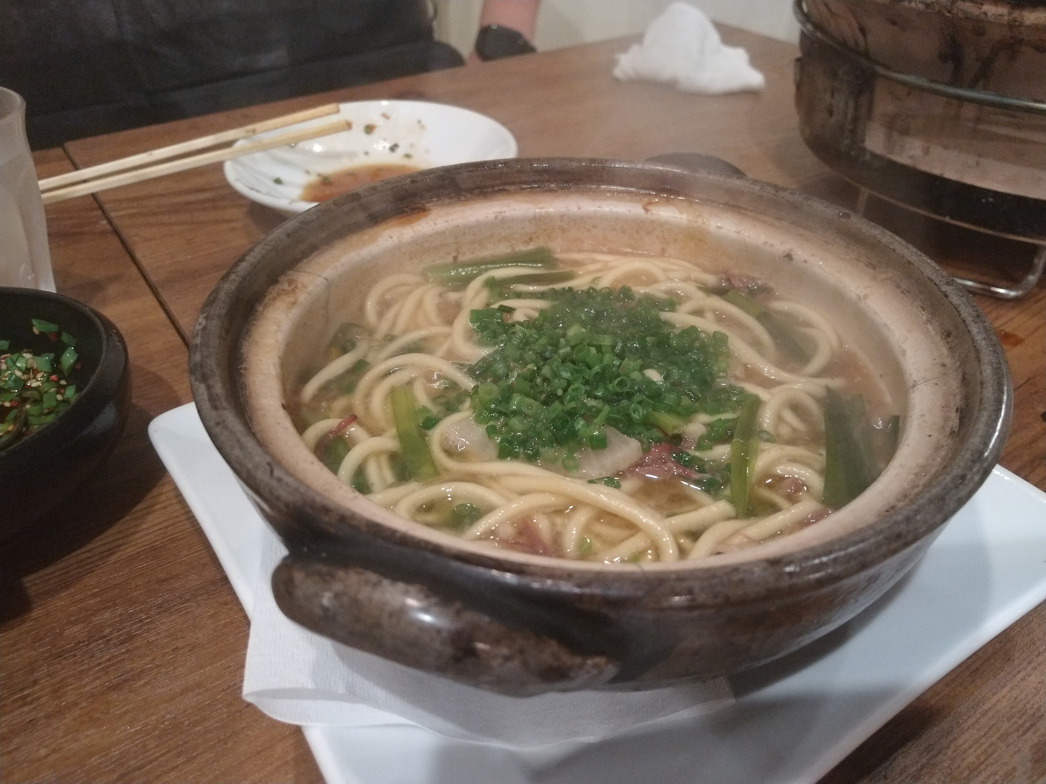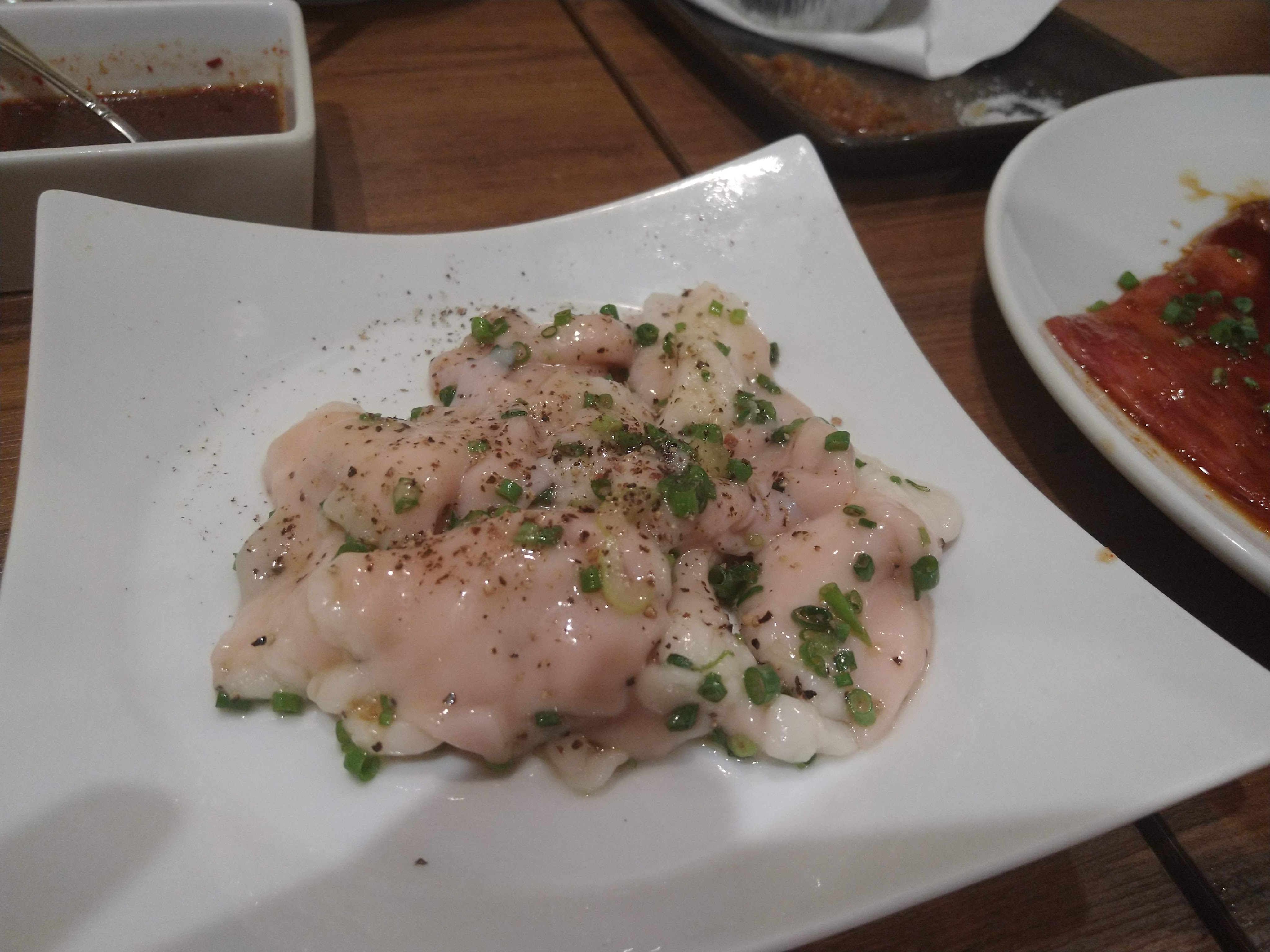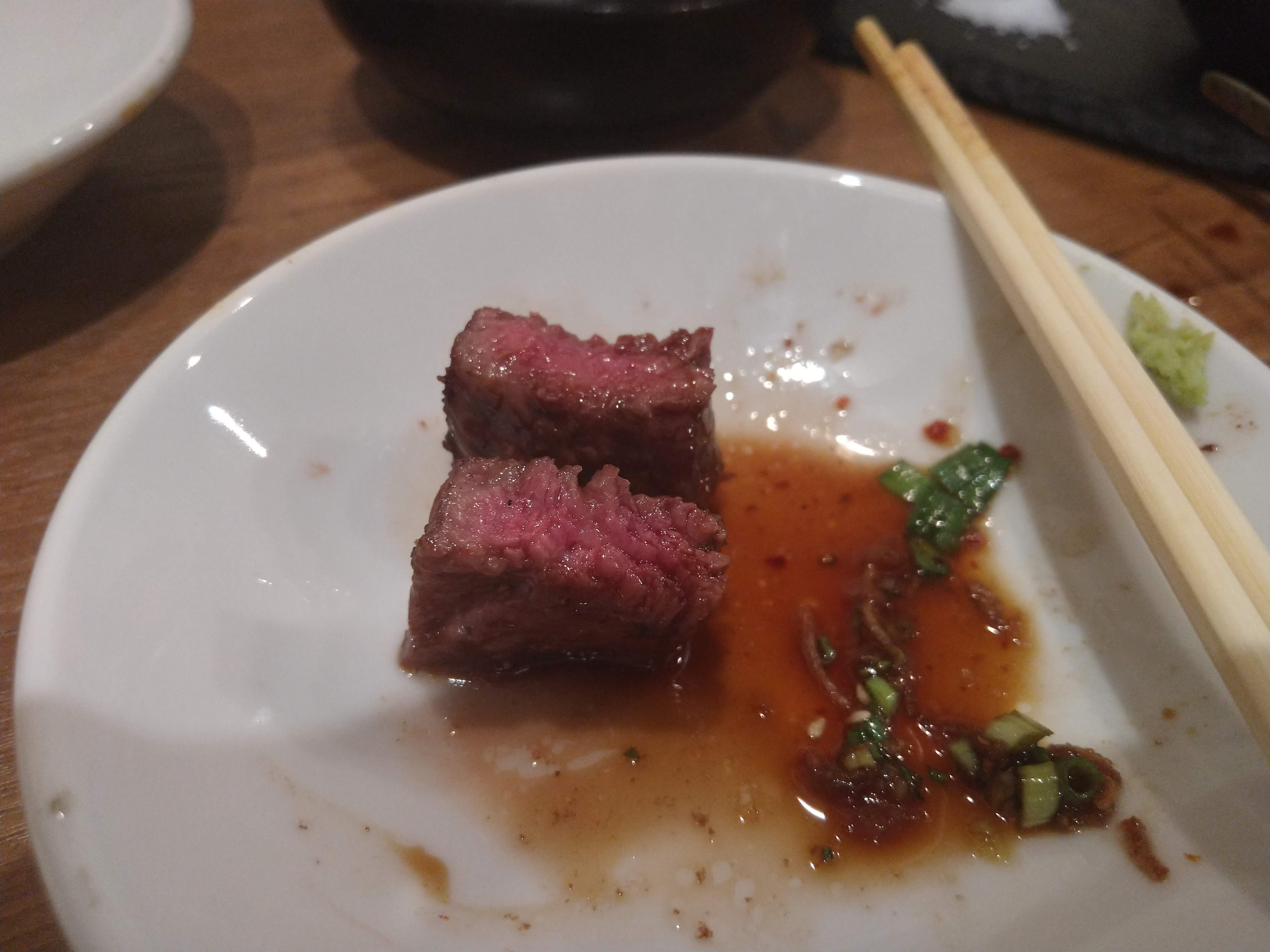 裏メニューのステーキ?赤身の肉が食いたいと言ったら教えてくれました。たしか、上ロースの肉をステーキ用にカットしたものです。たれも二種類ですが、もう時間がたって忘れてしまいました。左がポン酢的な味だった気がしますが、もうかなりおなか一杯になりかかっていたのでこちらの方がさっぱりして私にはよかったです。右のたれは味が濃くてうまみはこちらがつよく、かなりうまいたれです。