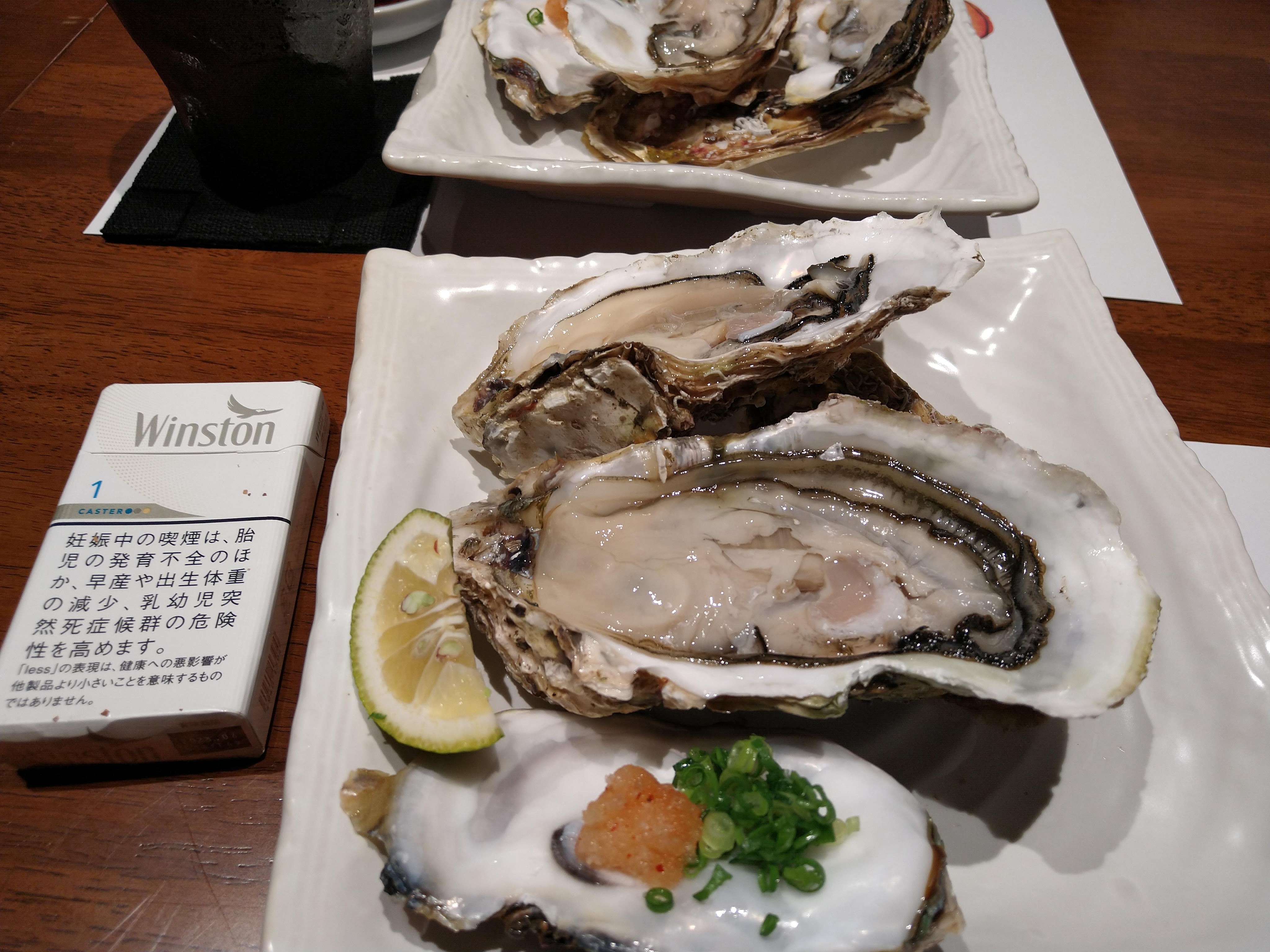 まずは、生牡蠣を一人二個づつ。写真のたばこと比較すればわかるようにかなり大きい。