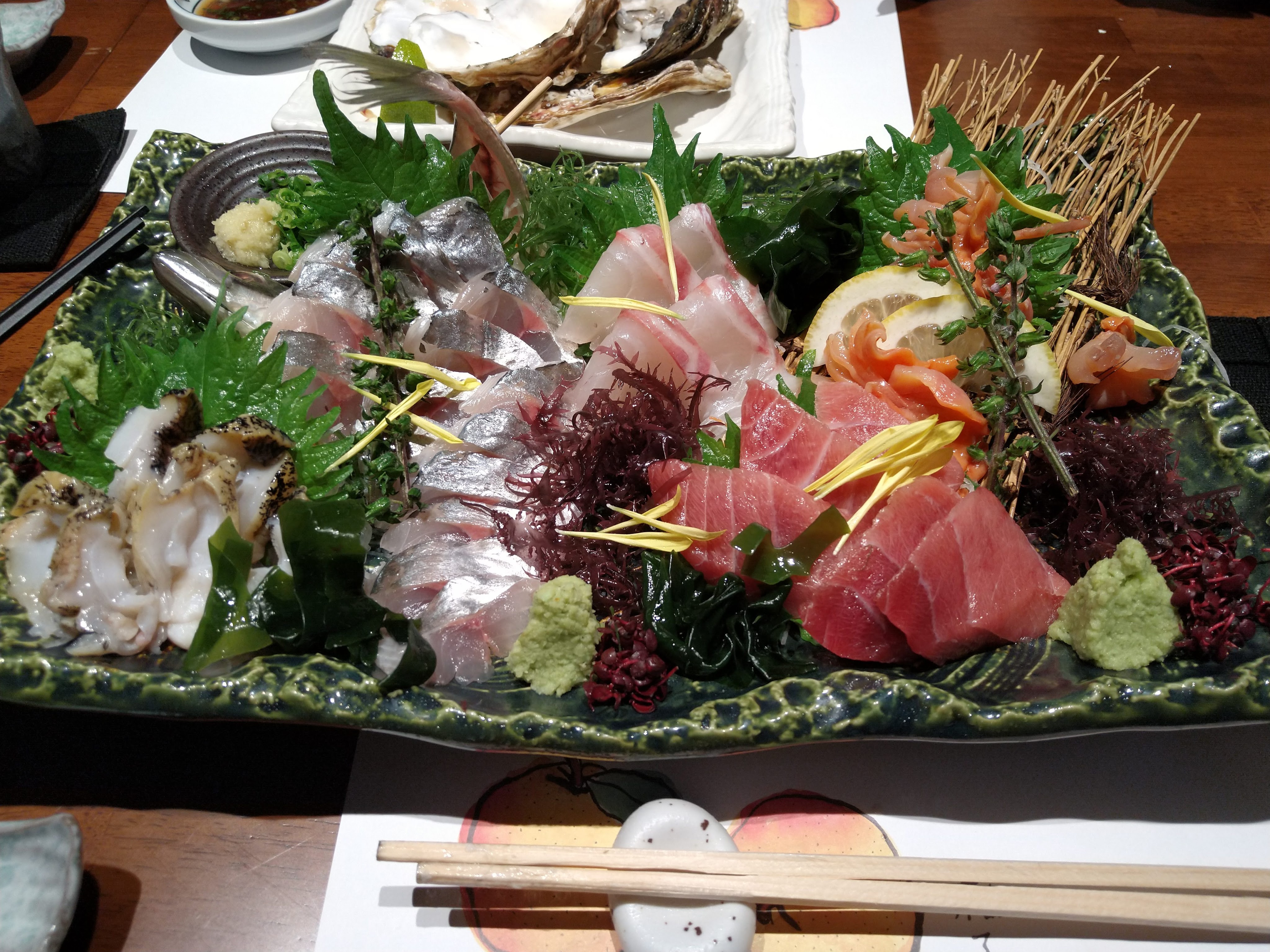 見た目も素晴らしい刺身五点盛。 左にアワビがありますが、アワビを食べて初めておいしいと思いました。その他は、鯵?鯛、鮪、赤貝。全般的に満足です。