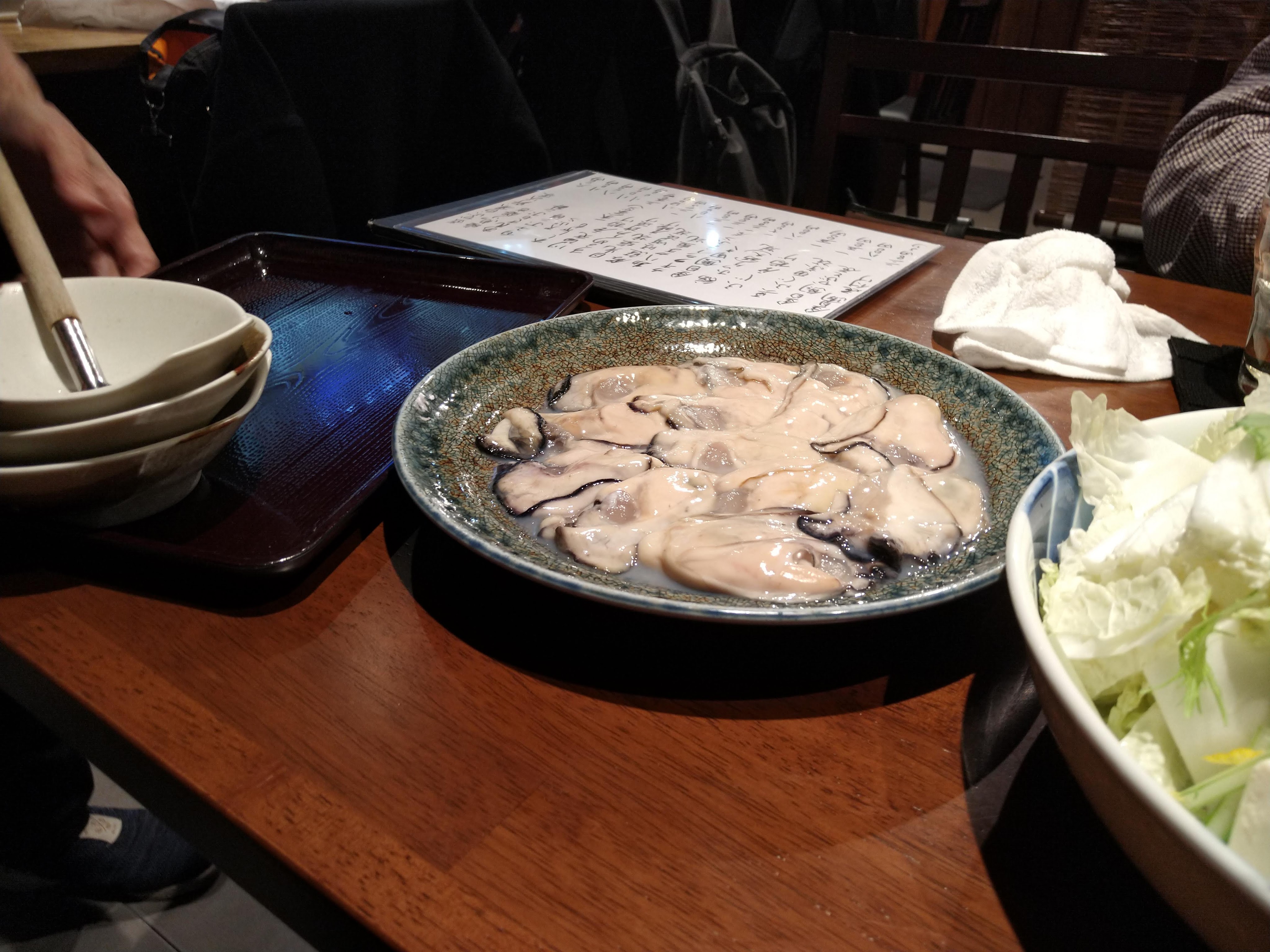 冒頭の写真は鍋用の野菜でしたが、牡蠣はこの通り。いつもの鍋を頼みましたが、通常鍋はメニューにはなく、コースの場合しかやっていないという事でしたが、なぜか予約したら出してくれました。この写真で伝わるかわかりませんが、牡蠣は相当に大きい。