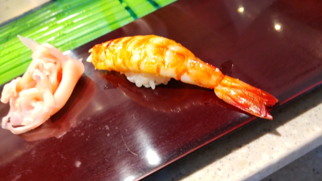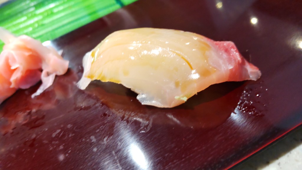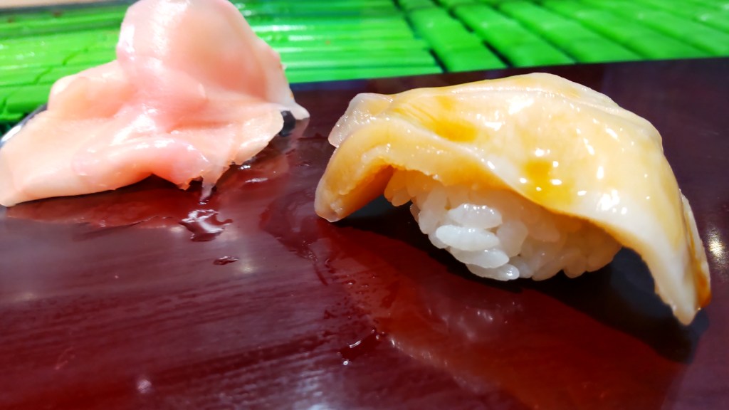 左の方が脂がのっているので、これは一応中トロになるのでしょうか? ここまでのネタを見ると、結構高級なネタばかり、と言う感じですね。これはこれでいいのでしょうが、必ずしも高級ネタが好きなわけではない私としては、最初から個別に頼んだ方が良かったかもしれません。でも初めてなので、一応一通り試してみるという点ではいいかと思いました。