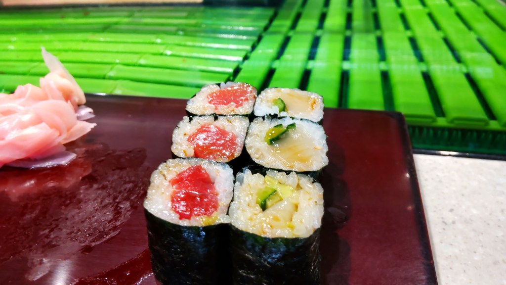 なんと、ここでもう巻物が出てきてしまいました。やはり、高級ネタが多い分品数が少ないのでしょう。この右側のは、なにかのひもときゅうりだったかと思いますが、これはかなり良かった覚えがあります。左の鮪もさすがの艶。
