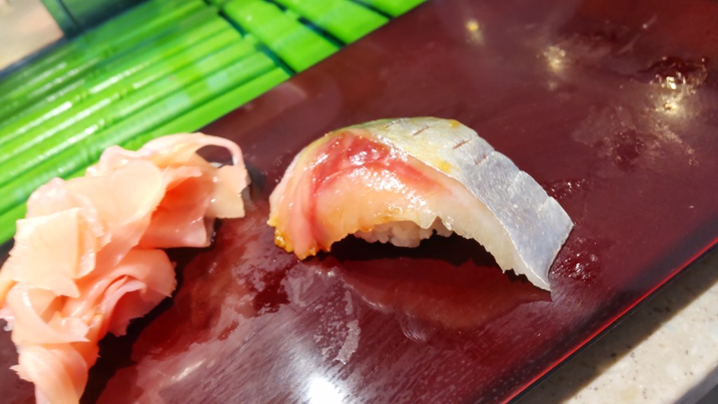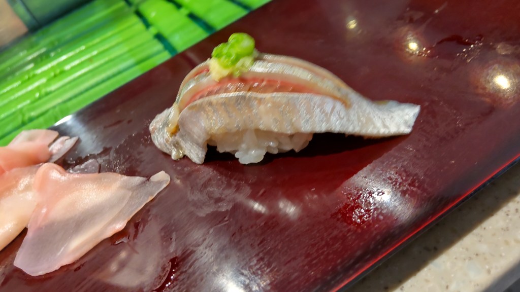 見た目からすると、鯖でしょうか? しめ具合がかなり浅く、かといって全くの生でもなく、さすがに鮮度の良い豊洲と思った記憶があります。個人的には光物が割と好きなので満足です。