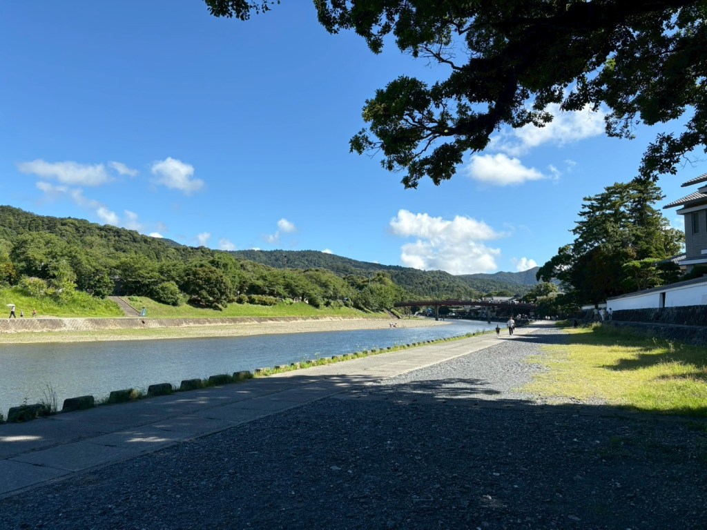 護岸工事こそされていますが、美しい五十鈴川。上流は伊勢神宮しかないわけだから水が大変きれいです。写真で見るとただきれいですが、実際は物凄く暑く、こんな時期に奈良・伊勢旅行などするものではない。というのが三日間の結論の一つです。